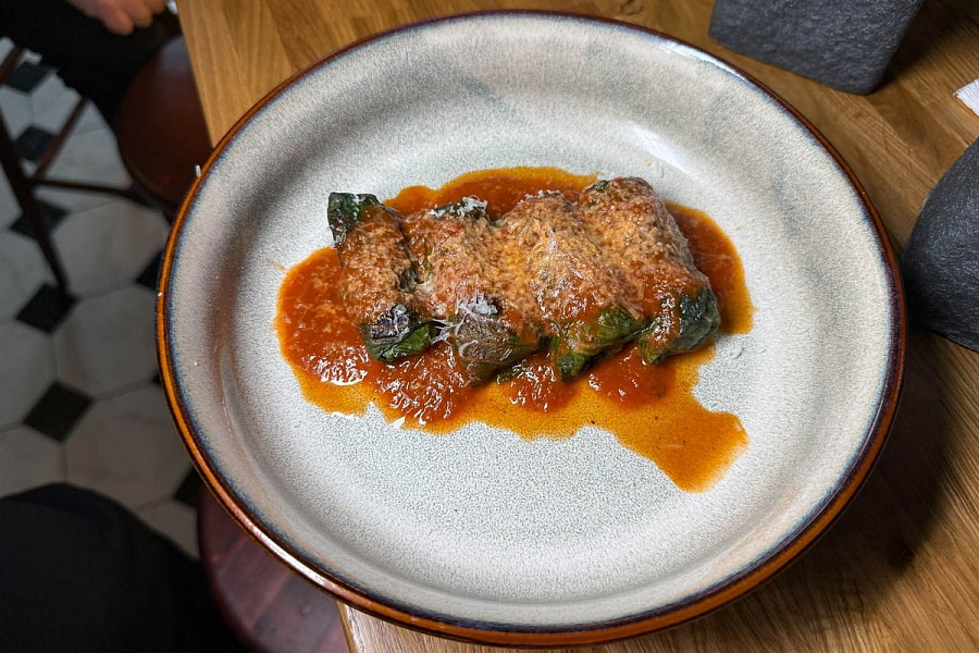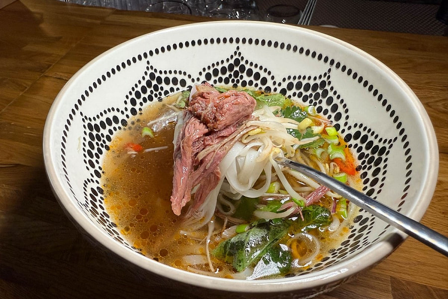 Цены: пряный баклажан — 17 рублей, голубцы с мидиями — 23 рубля, фо бо — 18 рублей.