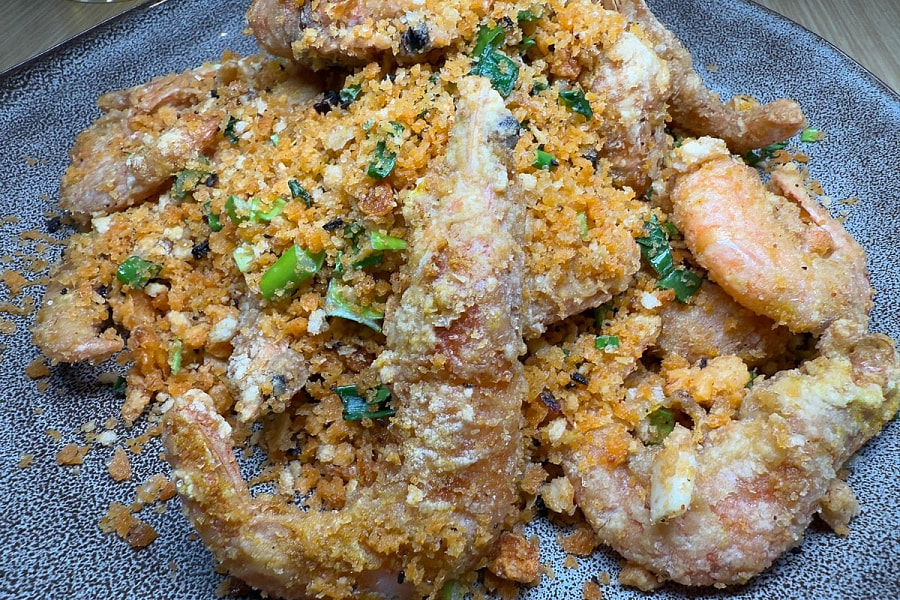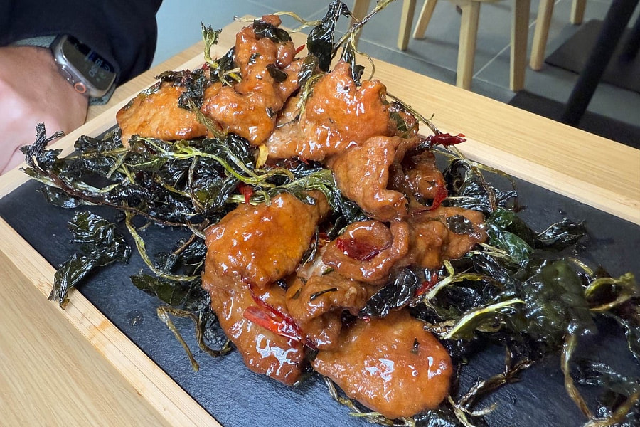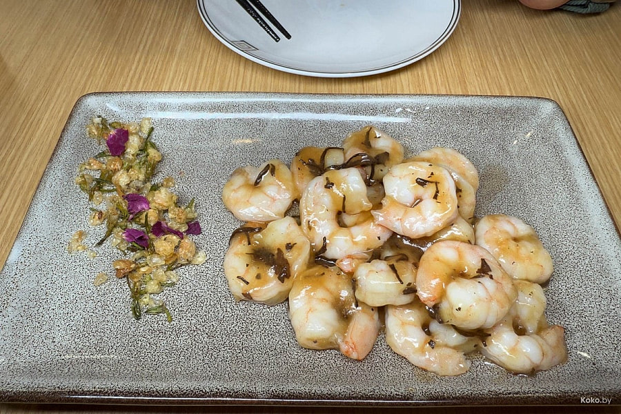 Цены: рыба «Ушан» — 88 рублей, сибас на пару — 40 рублей, жареные креветки — 36 рублей, гунбао с куриным филе — 28 рублей, овощи с арахисом — 22 рубля.