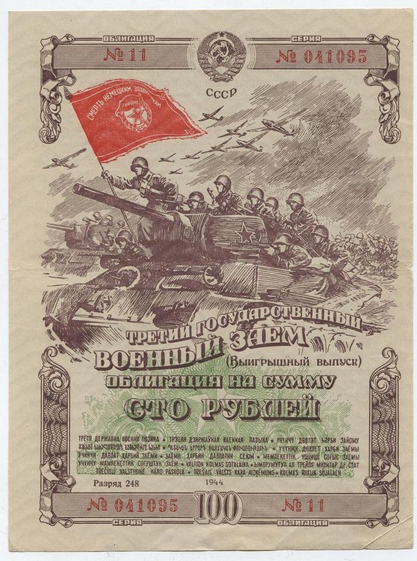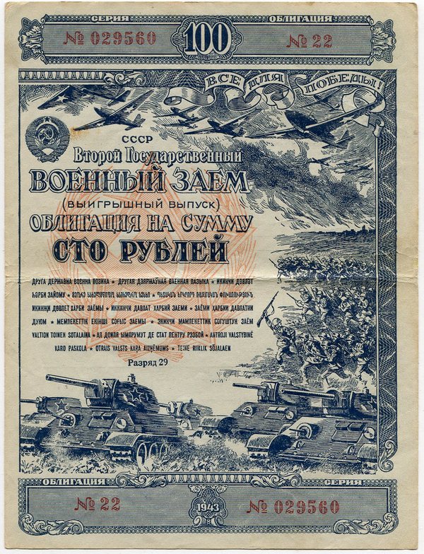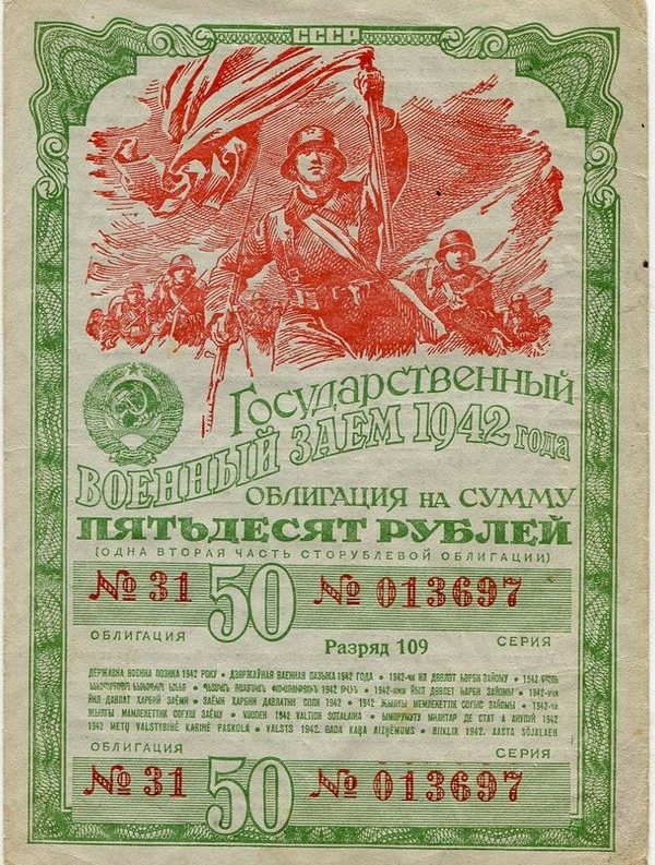 Для поддержки предприятий и армии с 1942 года советское правительство начинает активно использовать систему военных гособлигаций. Они распространялись по подписке среди населения.