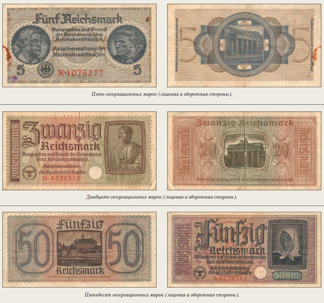 Кроме советских рублей и червонцев, военное время познакомило население страны с совершенно новыми деньгами. Как известно, на оккупированных территориях немецкие войска вводили в обращение рейхсмарки военного образца. Их печатали специальные имперские кредитные кассы. Денежные билеты выпускались номиналами 5 пфеннигов, 1, 2, 5, 20 и 50 рейхсмарок (они были пронумерованы, но не имели даты выпуска).
