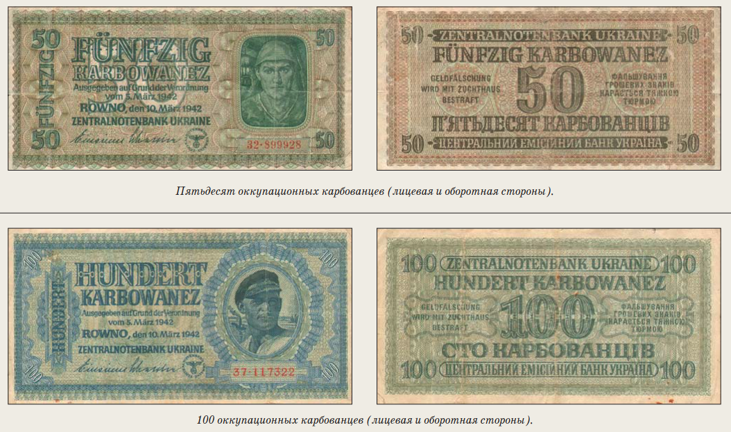 А в южных районах Беларуси в обращении были еще и карбованцы, которые печатали в рейхскомиссариате «Украина». Примечательно, что купюра номиналом два карбованца практически не появлялась в обращении — партизаны уничтожили почти всю партию этих денег по дороге из типографии.
