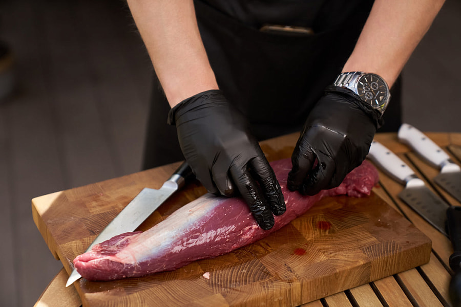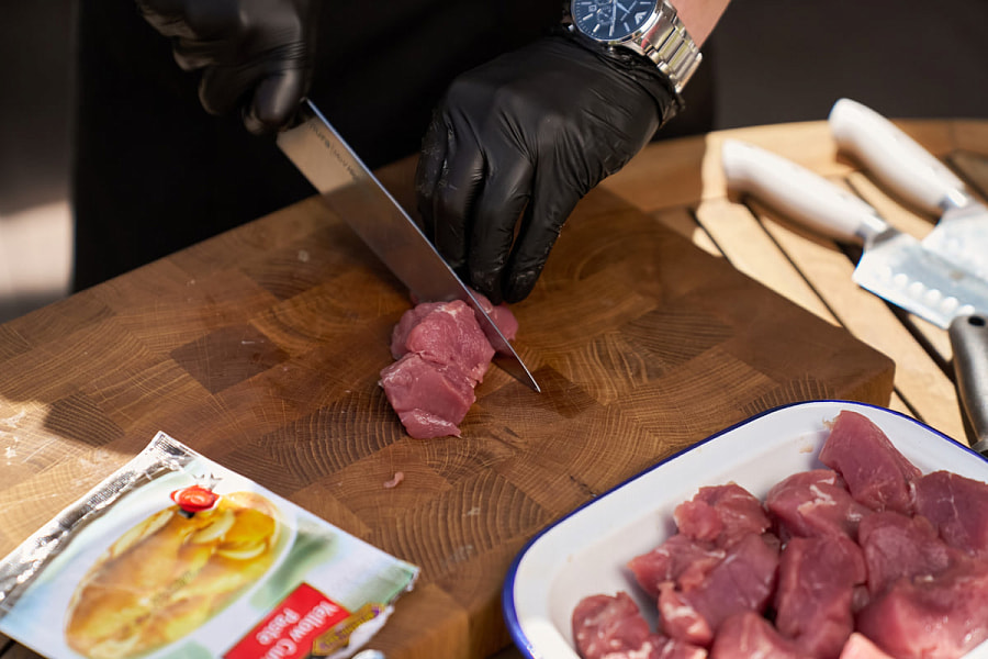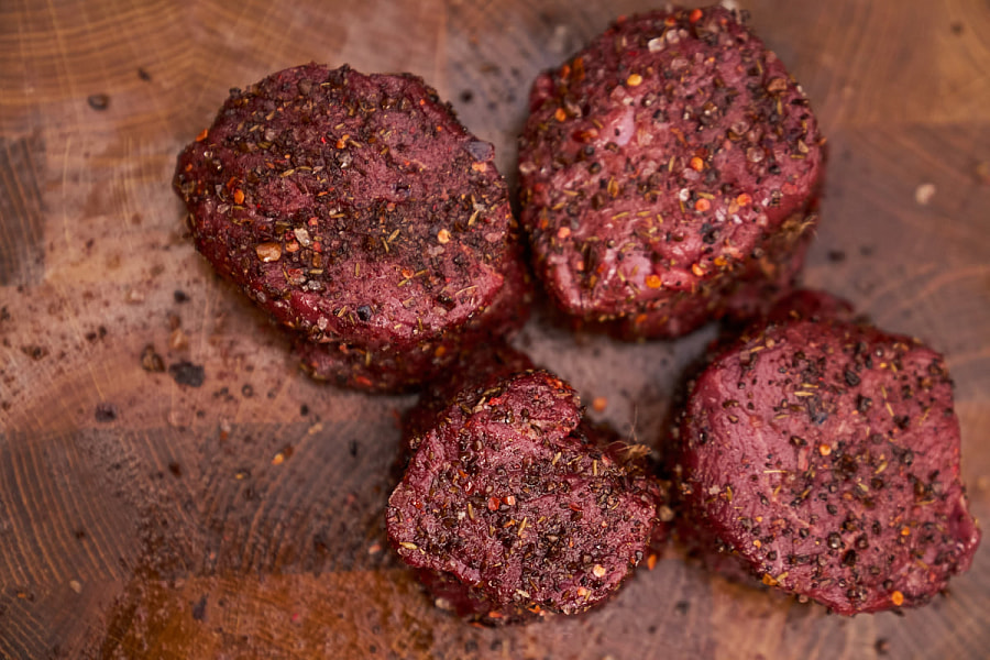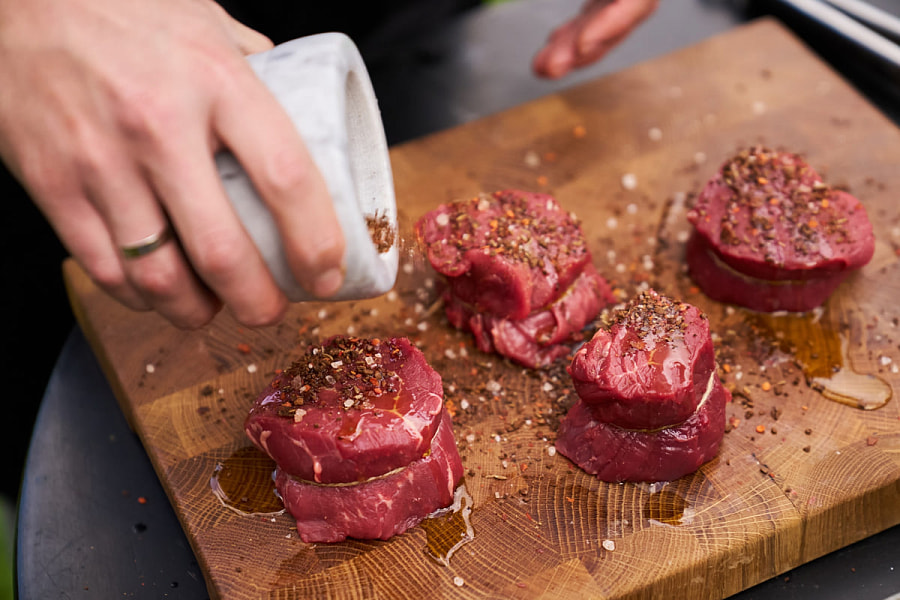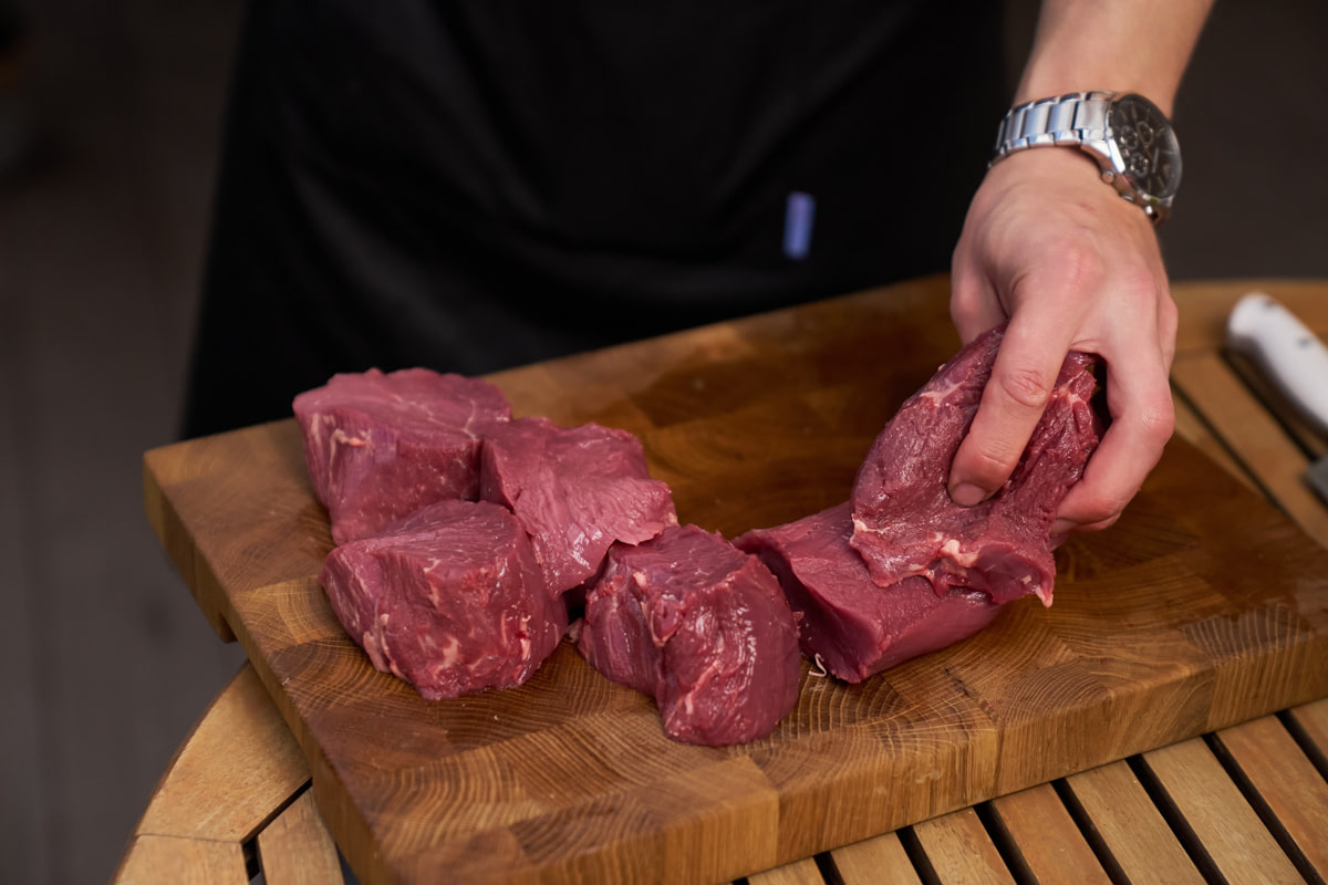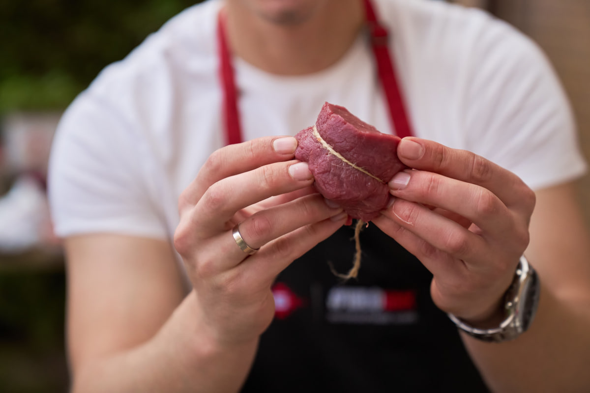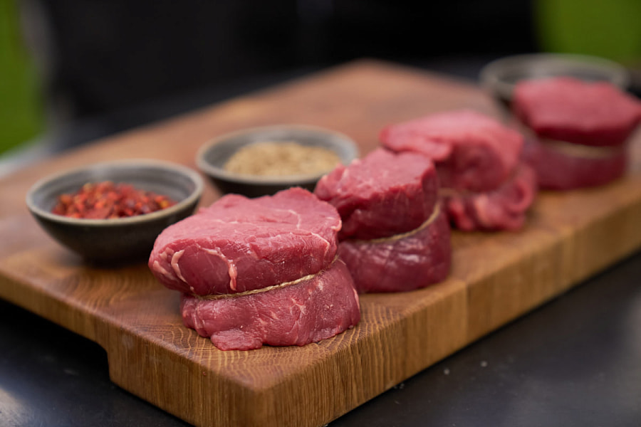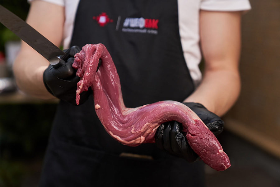 Дмитрий нарезает говяжью вырезку довольно крупно — по 5–6 см толщиной. А чтобы кусочки сохранили эту высоту и остались ровными бочоночками, перевязывает каждый поперек бечевкой. Маринада не будет.