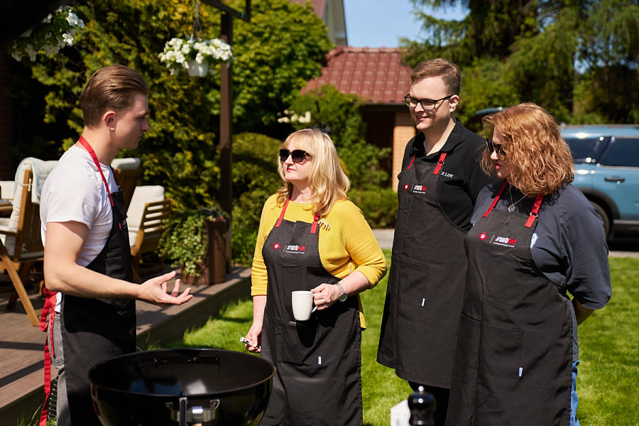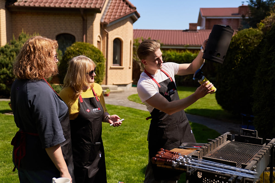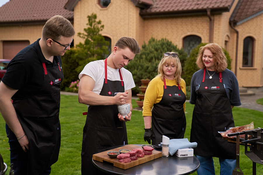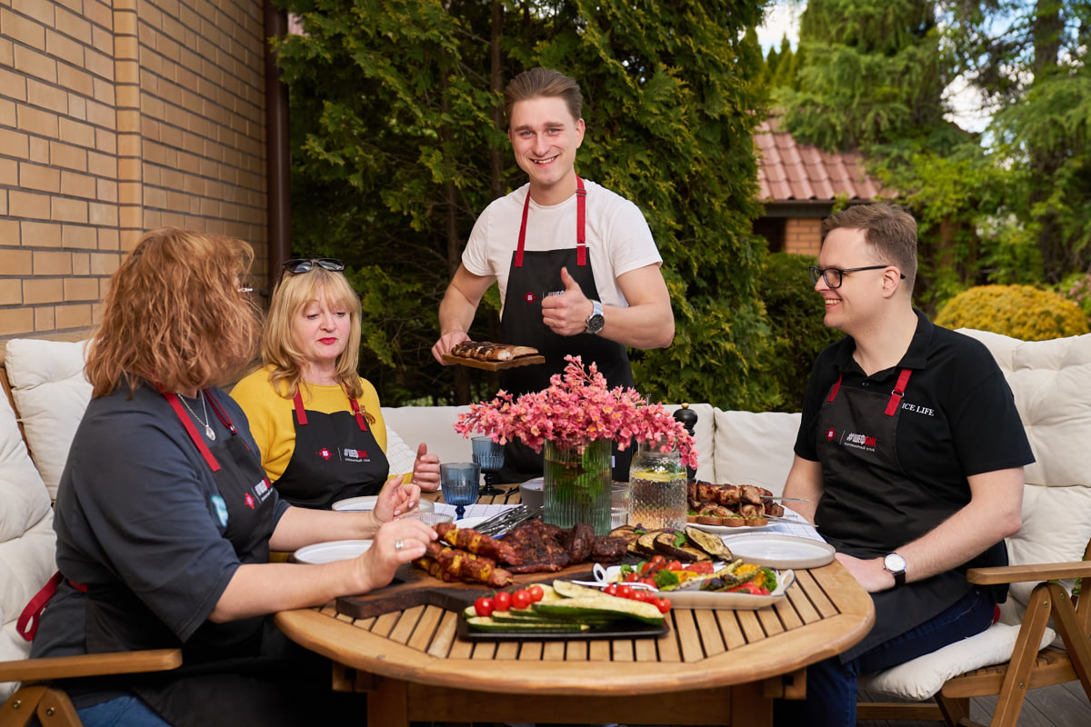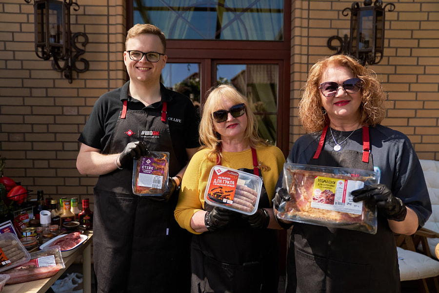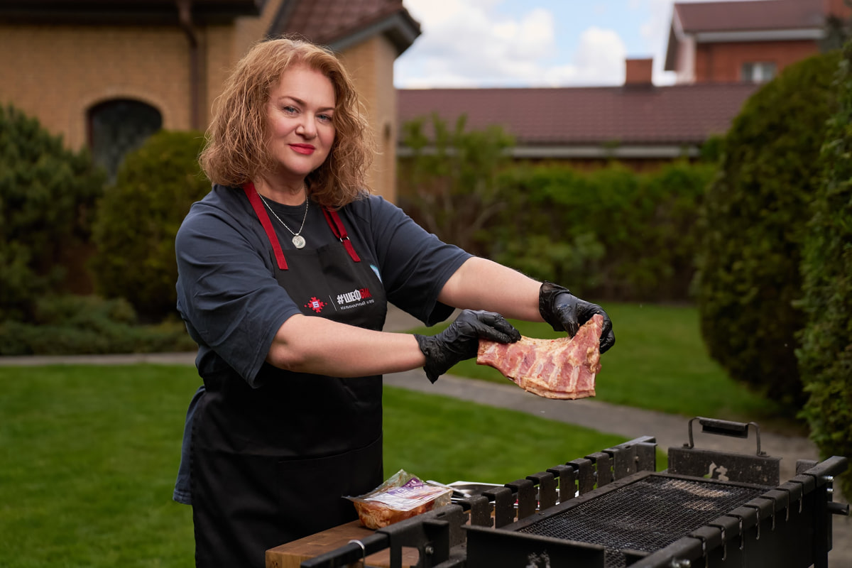 Бросить вызов профессионалу мы осмелились не просто так. Нам предоставили неограниченный выбор продуктов Брестского мясокомбината, просто созданных для приготовления на мангале: замаринованные шашлыки, ребрышки и стейки, колбаски. Наша задача была как минимум не испортить их (спойлер: это практически невозможно). В команде Office Life в этом поединке собрались гурманы: журналисты Раиса Юдина и Ярослав Лаберко, а также специалист по спецпроектам редакции Инна Бризинская. У каждого были свои мотивы. Инна отдала предпочтение ребрышкам для запекания «По-домашнему», т. к. всегда мечтала приготовить идеальные ребрышки на гриле. Ярослав выбрал стейк из свиной корейки «Грузинский ткемали». А я беру новинку Брестского мясокомбината — колбаски для гриля с французской горчицей. Признаюсь, у меня при приготовлении на сковородке колбаски всегда лопаются, несмотря на предварительно проколотую оболочку.