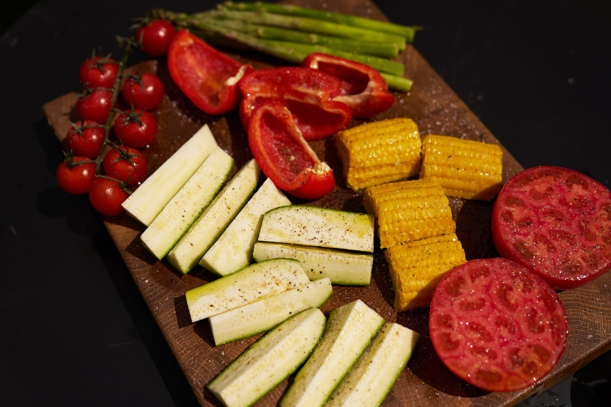 Рядом в это время готовятся стейки «Грузинский ткемали». Идеальный, на мой взгляд, вариант для барбекю. Их надо просто обжарить по семь минут с каждой стороны, и они уже вкусные и готовые к употреблению. Ярослав, которому ничего не надо было мудрить со стейками, решил добавить изюминку в гарнир. Нарезанные вдоль баклажаны и цукини он смазывает оливковым маслом с чесноком, солью, свежим розмарином и орегано. Овощи минут пять пропитываются этой ароматной смесью и отправляются на решетку мангала. Головку чеснока, завернутую в фольгу, мы запекаем прямо на углях. Размягченные томленые зубчики останется размять и намазать на подсушенные ломтики хлеба — и вкусное дополнение к гарниру готово.