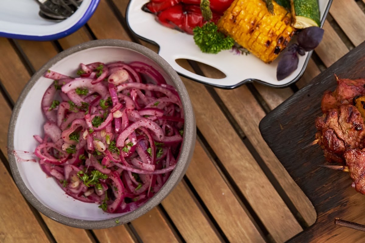 Украшением гарнира от шеф-повара стал красный маринованный лук, который отлично подходит к любому мясу на гриле.
