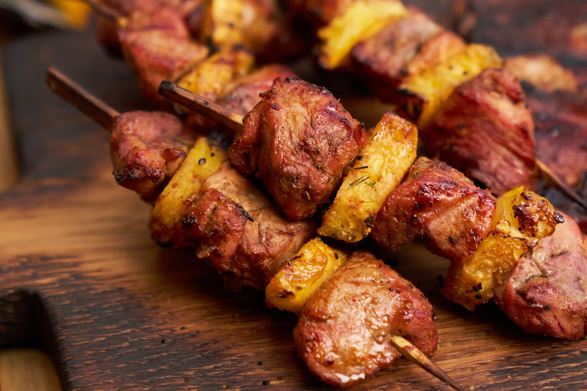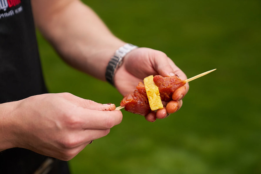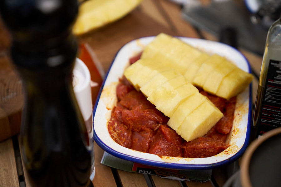Вырезка нарезается небольшими кусочками, минут пять пропитывается маринадом — пастой карри. Ананас чистим и нарезаем на кубики. Перемешиваем с замаринованным мясом. Нанизываем на шпажки (их желательно предварительно смочить водой), чередуя мясо и ананас. Жарим на гриле под крышкой 10 минут.