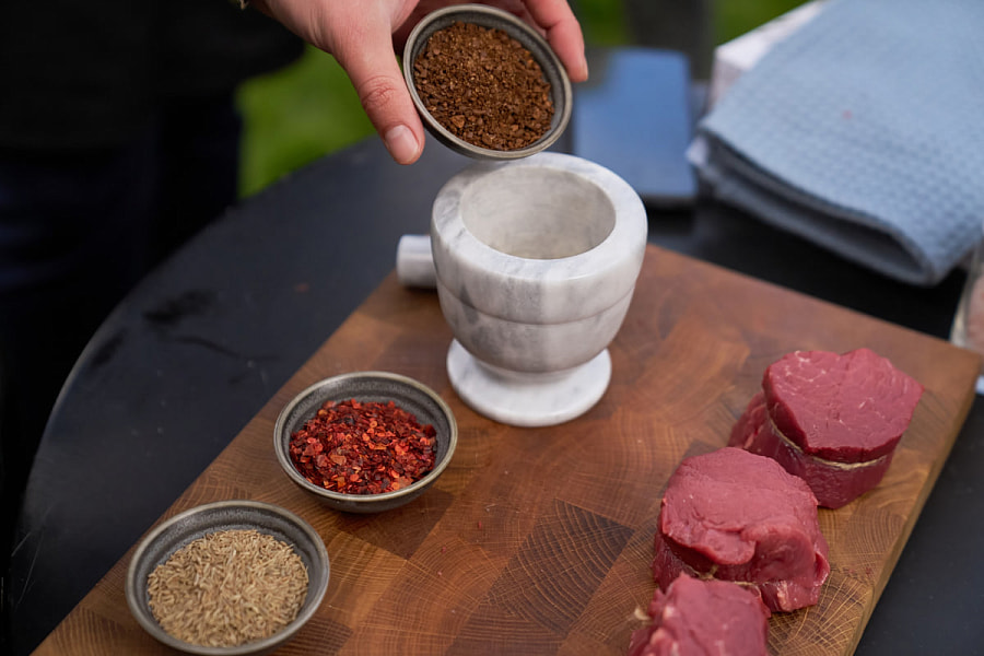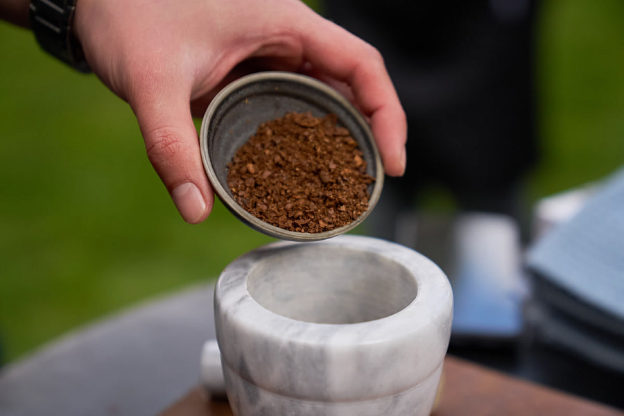 — Здесь будет оригинальная посыпка, — говорит Дмитрий, по очереди забрасывая в каменную ступку ингредиенты. — Берем зерна кофе (крупно смолотые), соль, зиру, немного хлопьев чили и перетираем. Можно сделать это блендером или кофемолкой, но не молоть в муку.