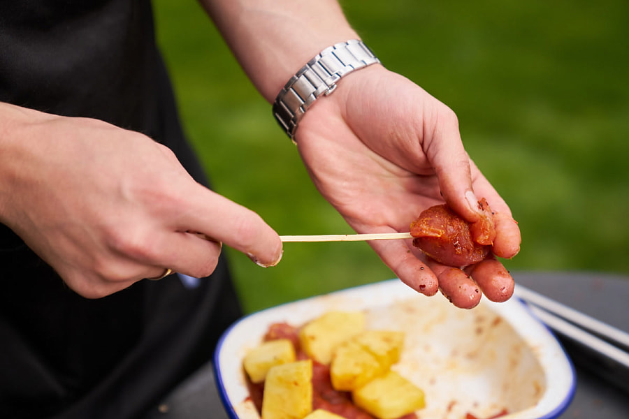 Выбрав продукты, идем в мангальную зону. Дмитрий Дубчук, шеф-повар кулинарного клуба Брестского мясокомбината #ШЕФБМК, с которым мы собираемся посоперничать, сразу делится ценными лайфхаками. Благодаря ему колбаски остались целыми и невредимыми, несмотря на все переворачивания во время жарки. Оказалось, их надо наколоть (зубочисткой, вилкой или острой шпажкой) дважды — перед приготовлением и когда они только-только «схватятся» на мангале.
