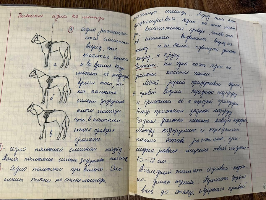 Когда мама видела меня верхом на нем, у нее случался нервный срыв, который слышала вся деревня, а дед благоразумно исчезал из поля зрения. Но этого коня было невозможно не любить — он был мягкий, дерзкий и очень добрый. В библиотеке я нашла литературу по устройству коневодства и выездке, все переписала в тетрадочку.