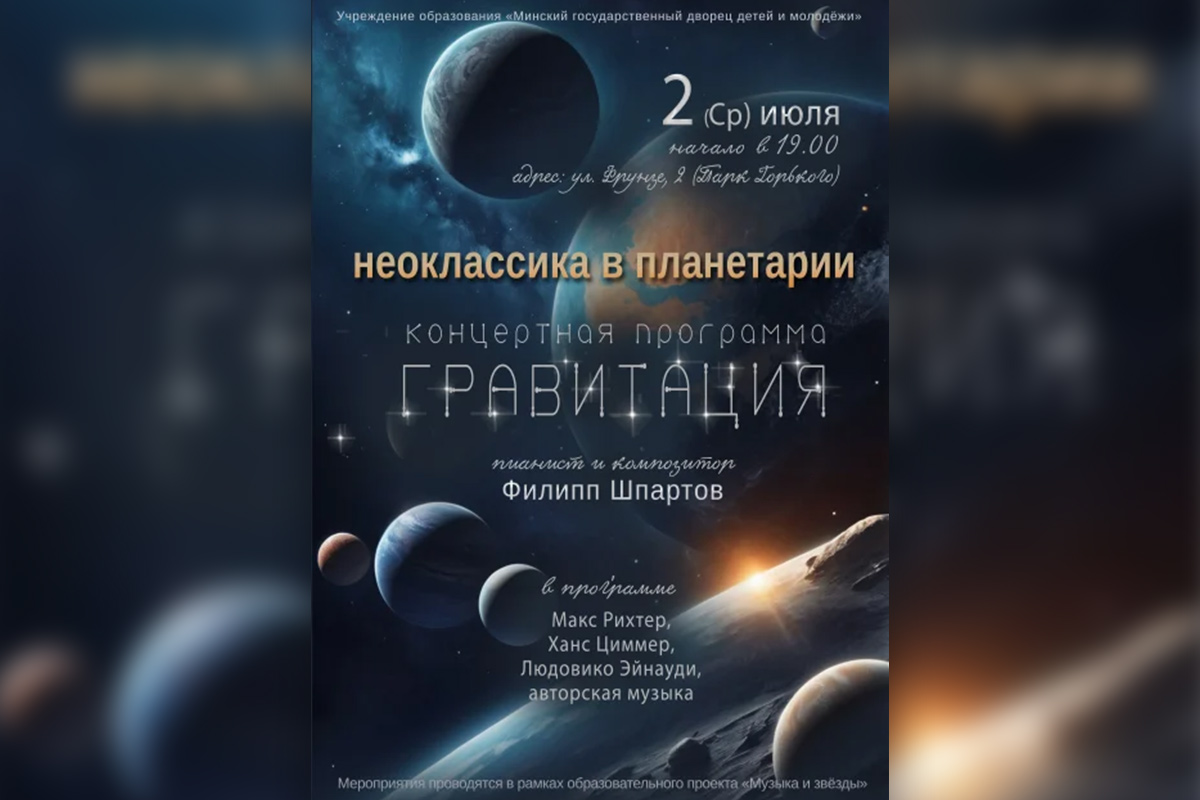 Программа «Гравитация» — это не просто музыкальный концерт, это возможность отвлечься от повседневной суеты и ощутить себя частью огромной, бесконечной вселенной. Автор проекта — пианист и композитор Филипп Шпартов, выпускник Московской консерватории, номинант на музыкальную премию ZMR-awards как лучший новый артист, участник различных концертов и фестивалей в Беларуси и за рубежом.