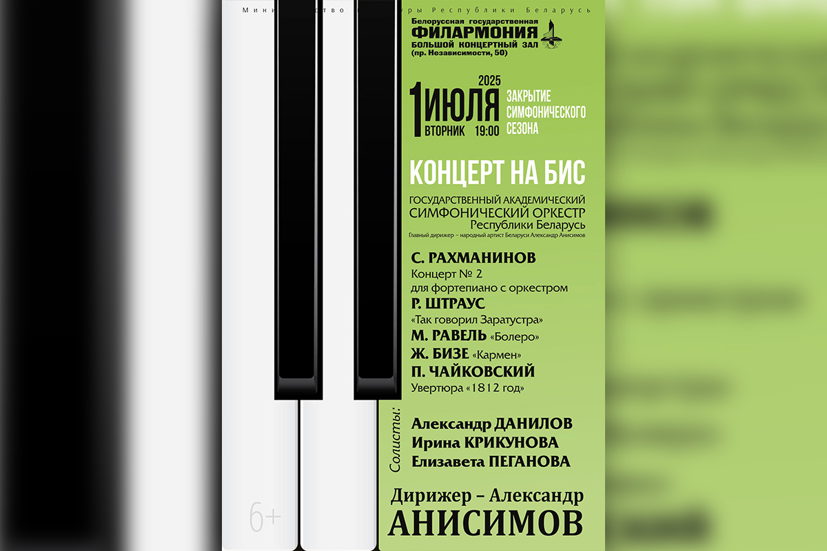 Это дополнительный концерт — закрытие сезона. В Большом зале филармонии прозвучат самые узнаваемые и любимые произведения Сергея Рахманинова, Рихарда Штрауса, Жоржа Бизе, Мориса Равеля, Петра Чайковского. Дирижер — народный артист Беларуси Александр Анисимов.