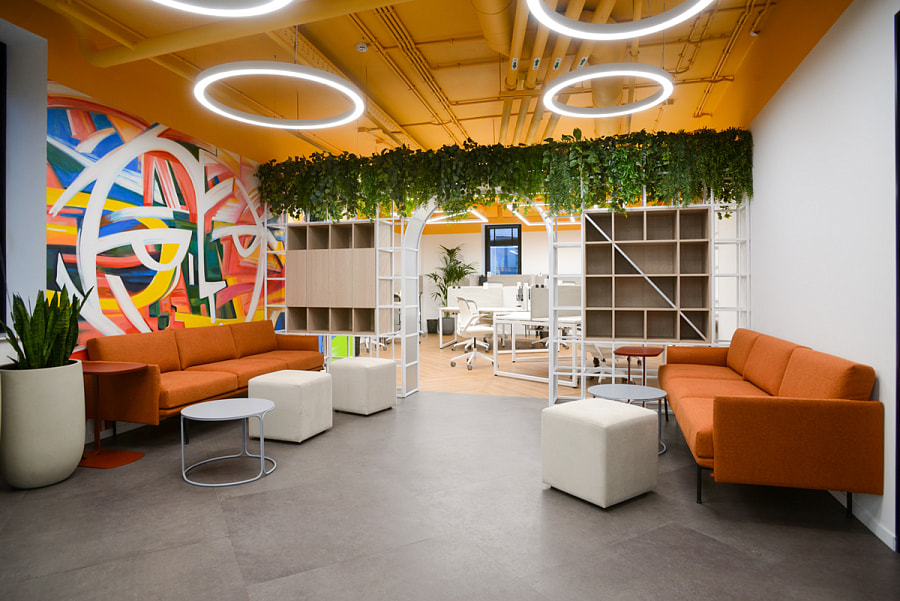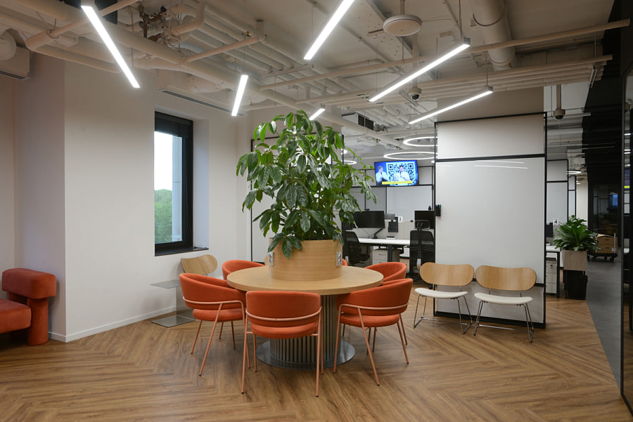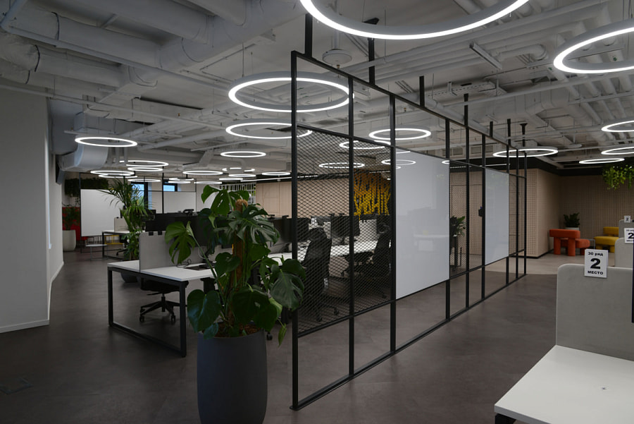 Один из ключевых трендов сейчас — так называемый гибридный офис. В таком офисе пространство разбито не на кабинеты, а на зоны и включает в себя разные элементы: open space с рабочими местами, «уголки для уединенной работы» и зону отдыха.