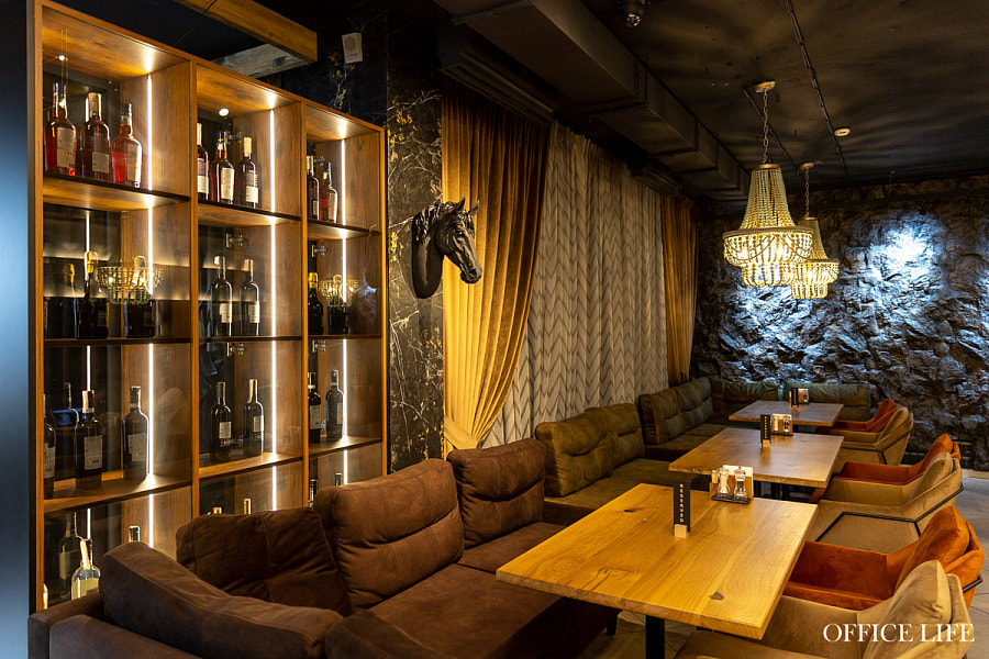 А к зиме здесь появится еще два тематических зала поменьше. Один — для мужских компаний — будет выполнен в брутальном клубном стиле с камином, виски и репликами оружия на стенах. Он рассчитан примерно на 15 человек.