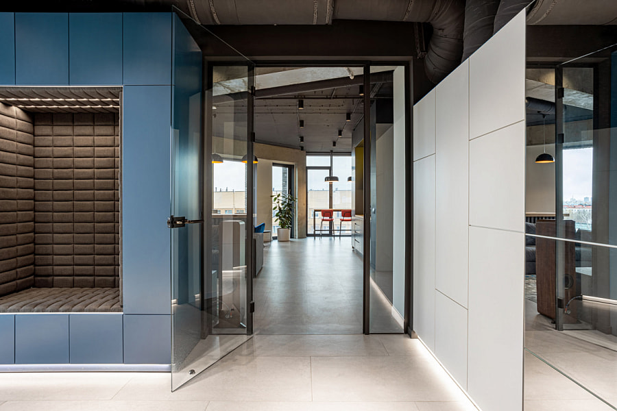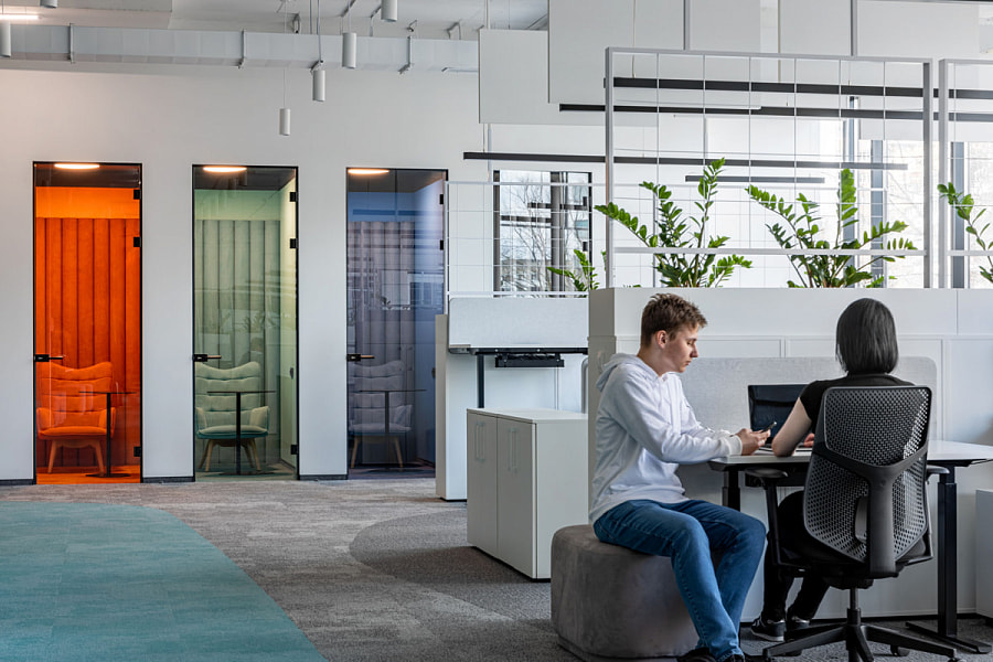 Есть возможность выбирать: работать в общем пространстве или уединиться для концентрированной работы, то есть соблюден баланс приватности и открытости.