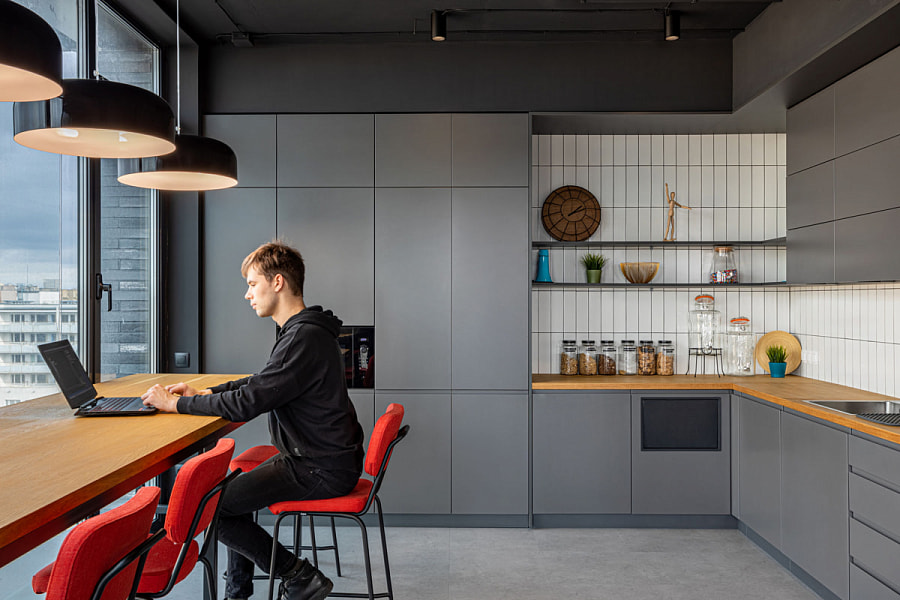 Центром офиса стала многофункциональная кухня-гостиная. По сути это пространство для неформальных встреч, мозговых штурмов и корпоративных мероприятий. Здесь удобные диваны и хорошая возможность поработать с ноутбуком.