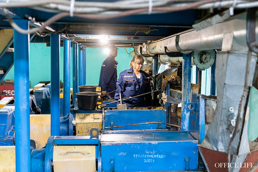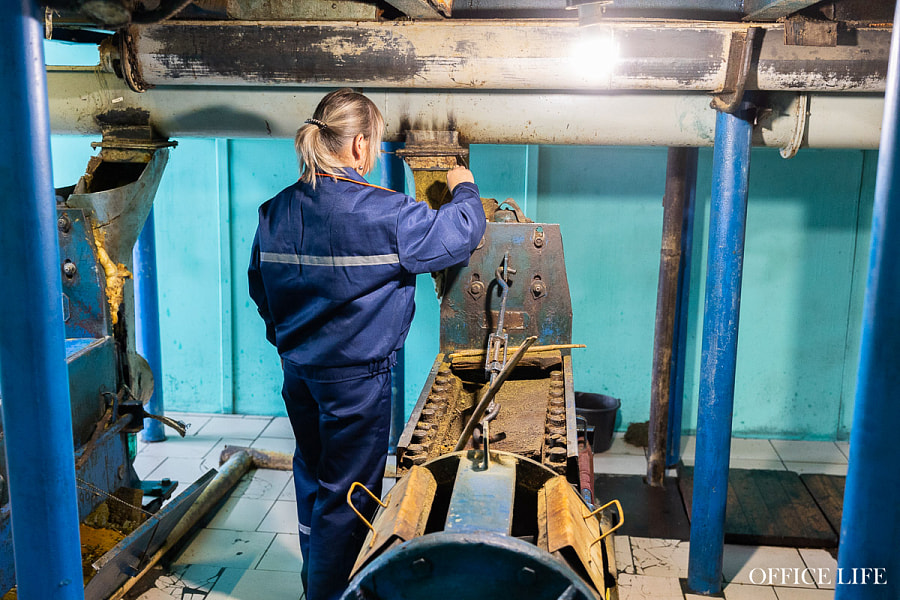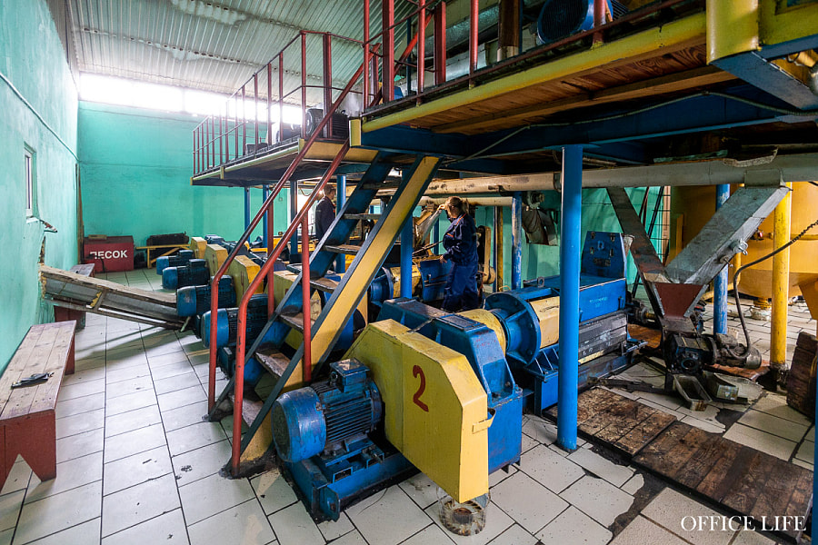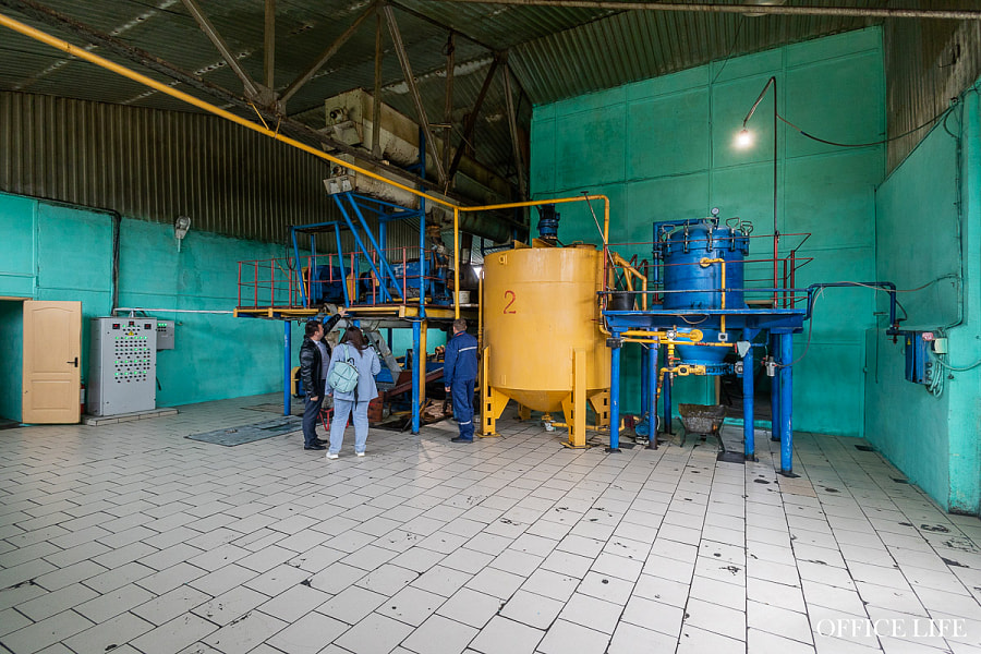 Двадцать дней в месяц оборудование и люди работают круглосуточно. Затем пять дней — отдых, очистка, профилактика. Рапс попадает в цех из трех точек: если какая-то партия рапса окажется не самого высокого качества, он «разбавится» хорошим, и не испортит итоговый продукт. Затем он проходит через систему очистки, после перемалывается до состояния муки. Дальше — первичный отжим, когда и получают жмых — корм для животных. Этот корм ценят сельскохозяйственники: он увеличивает надои молока. А масло идет дальше — на второй отжим и фильтрацию.