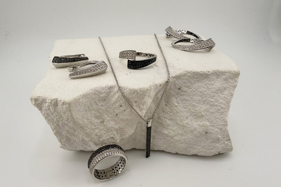 А вот коллекция Trend — это современная геометрия и многослойность. Такие изделия отлично выглядят в повседневных образах и гармонично дополняют вечерние платья. В коллекции много контрастных изделий с черными и классическими бриллиантами.