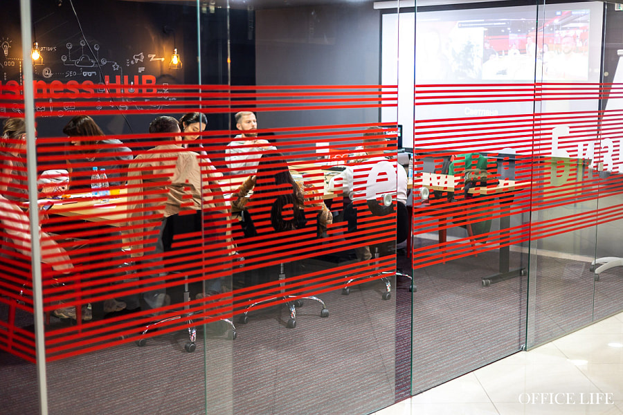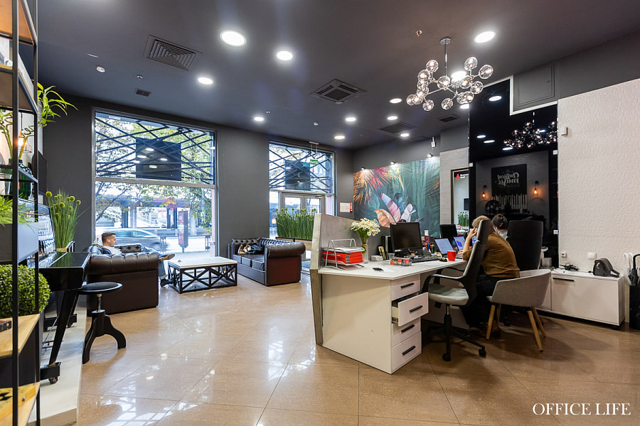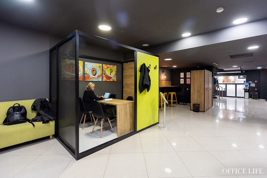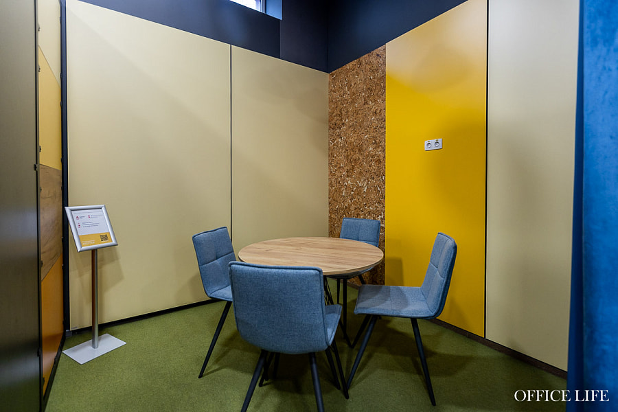 На двух этажах коворкинга общей площадью около 400 кв. м находится зона open space со всеми коммуникациями, семь переговорных комнат разного дизайна и размера, а также конференц-зал на 50 человек. Есть даже звукоизолированная капсула, где можно приватно поговорить по телефону, в мессенджере или Zoom. Работает хаб с девяти утра до девяти вечера, и не только в рабочие дни, но и по субботам.