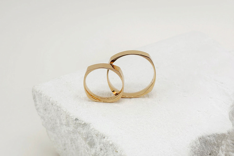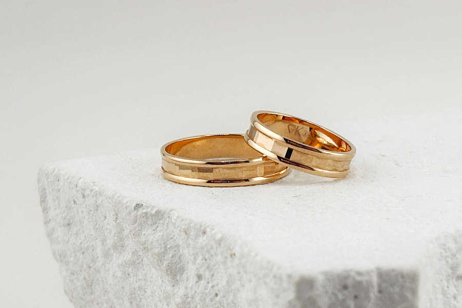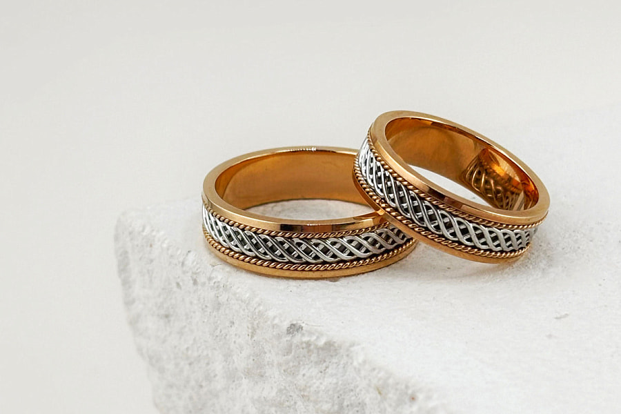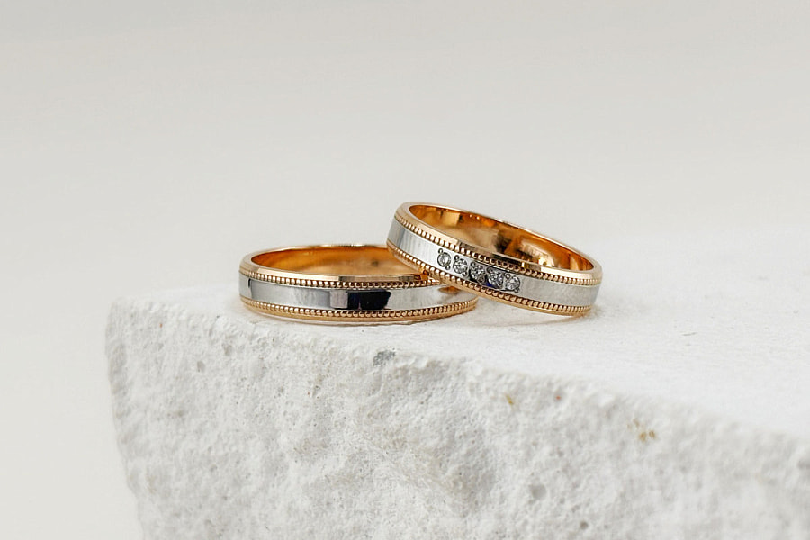 Кольца могут быть из одинакового золота, но при этом в женском будут бриллианты, а в мужском — нет. У невесты может быть крупное, заметное кольцо, например, из комбинированного золота с бриллиантами, а у жениха — сдержанная золотая классика.