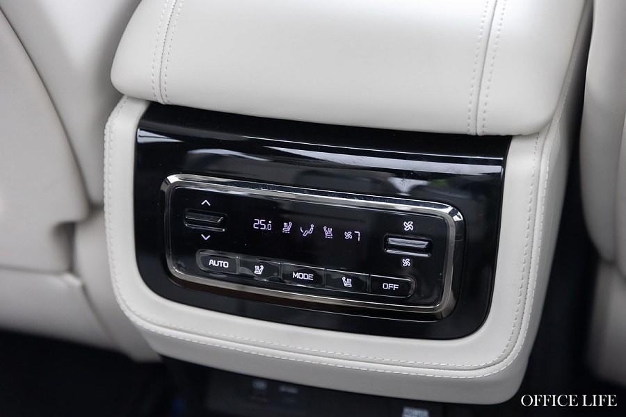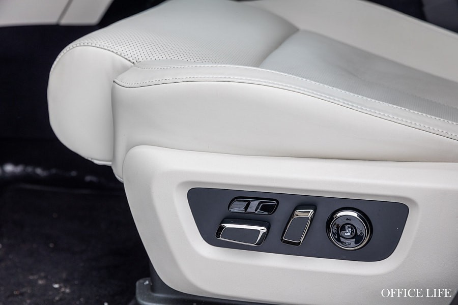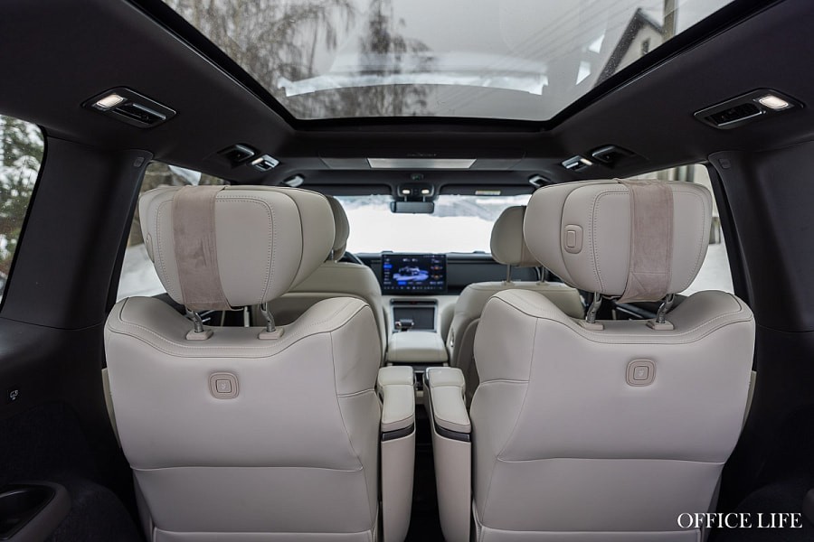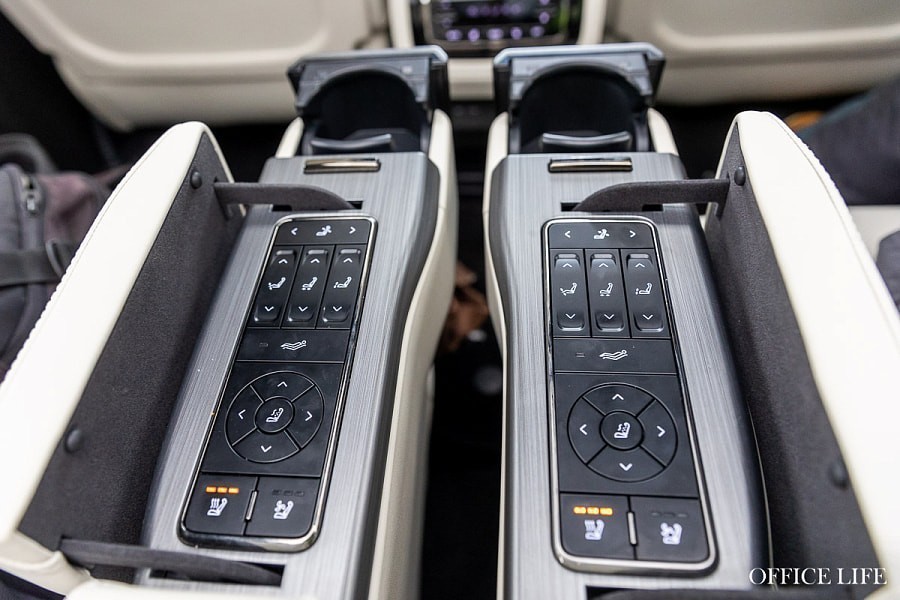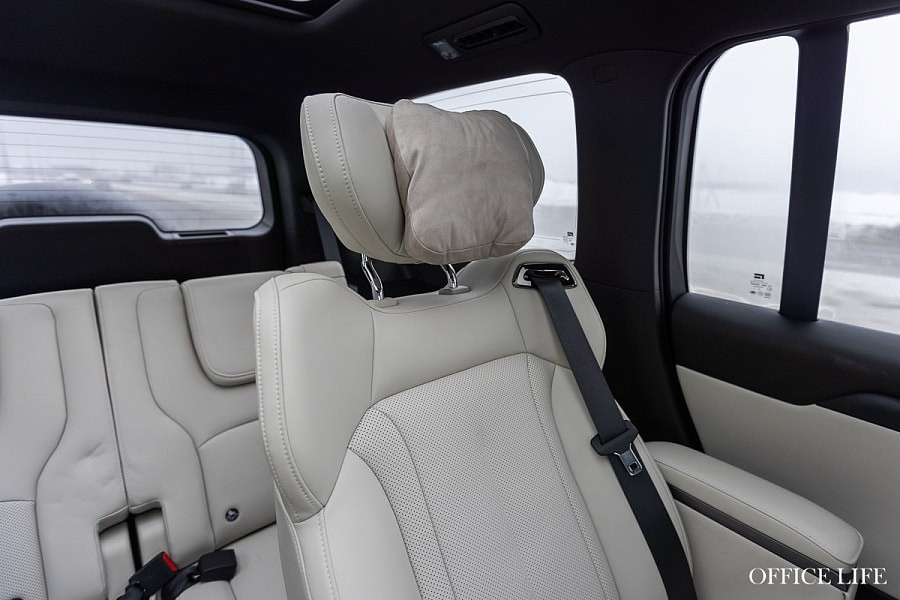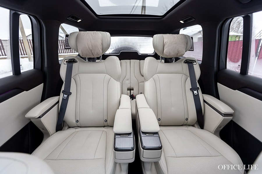 И в самом деле, второй ряд сидений — как бизнес-класс в самолете. Кресла с подогревом, вентиляцией, массажем и так называемым «режимом нулевой гравитации». Есть даже выдвижная оттоманка под ноги и мягкая подушечка под головой. В рукоятки сидений, как в дальнемагистральных лайнерах, встроены пульты, чтобы всем этим было удобно управлять. Конечно, есть во втором ряду и свой климат-контроль, и монитор, опускающийся из ниши в потолке.