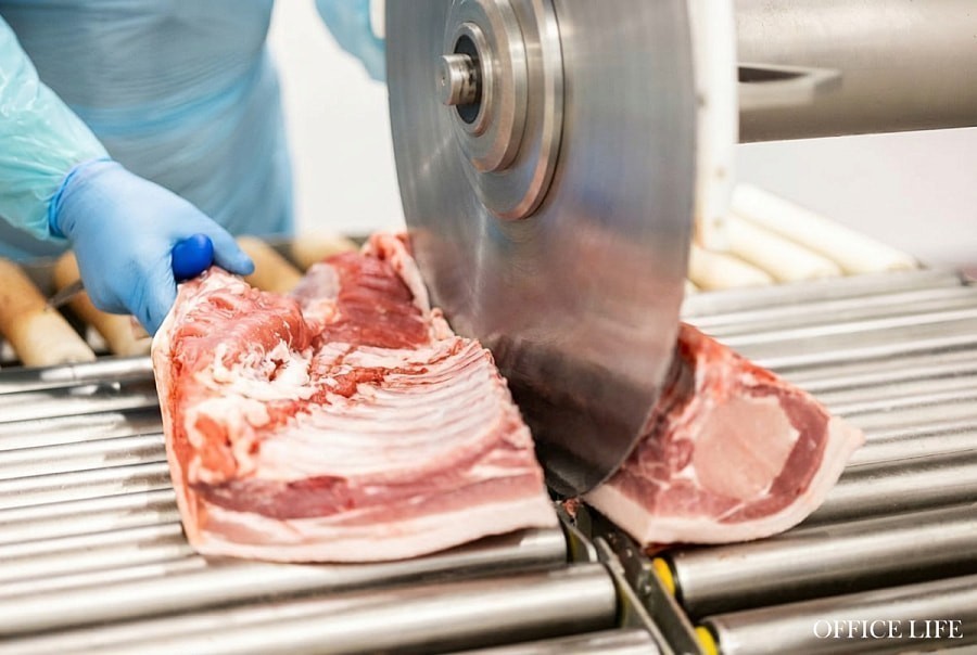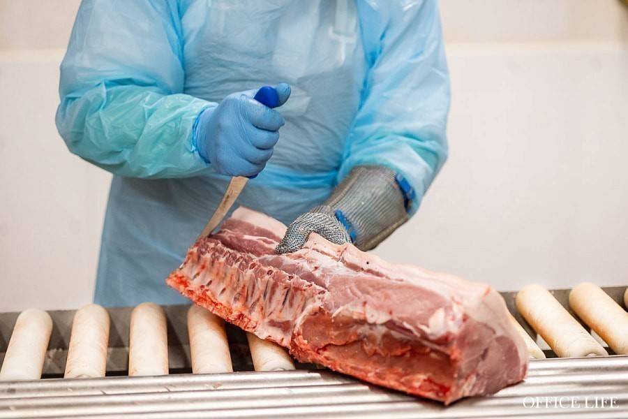 С процессом производства белорусского прошутто мы знакомимся уже на участке разделки и обвалки, куда поступают из холодильника свиные полутуши. Обвальщики выделяют нужные куски из тазобедренной части, причем строго по мышцам, заданной формы, без повреждения волокон. Это важно для внешнего вида и микробиологии будущих копченостей.