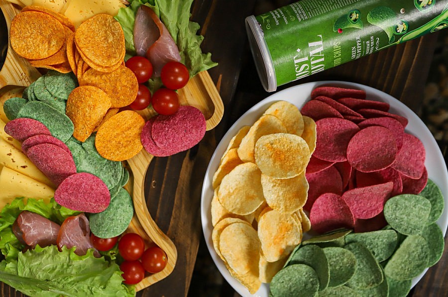 А как красиво их можно сервировать на тарелке, деревянной доске или в больших бокалах: красные, зеленые, черные, белые или оранжевые овальные чипсы выглядят очень эстетично — всем гурманам, которые открыты для новых впечатлений, точно понравится.
