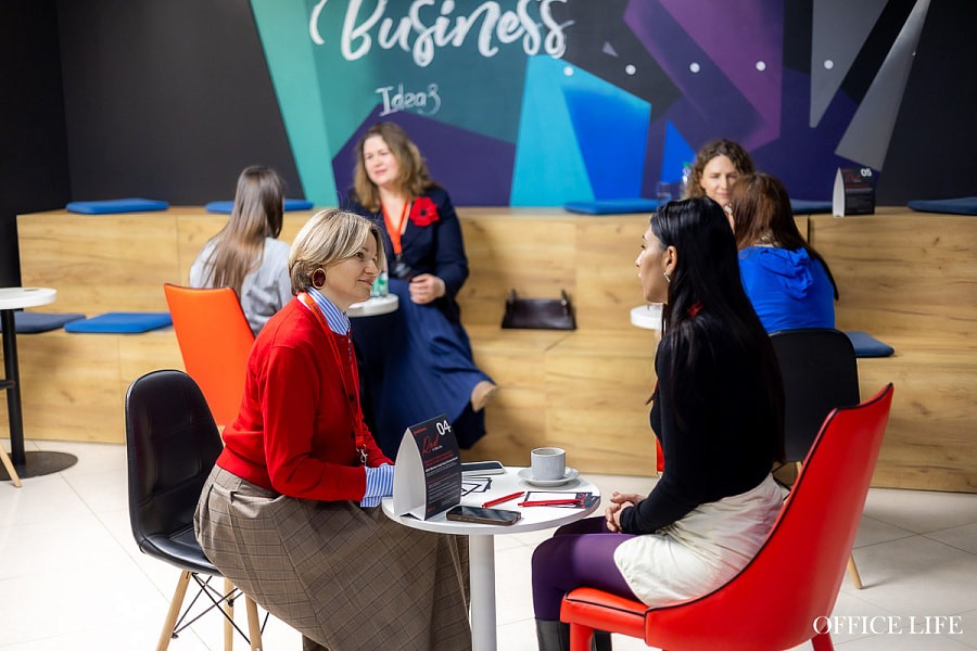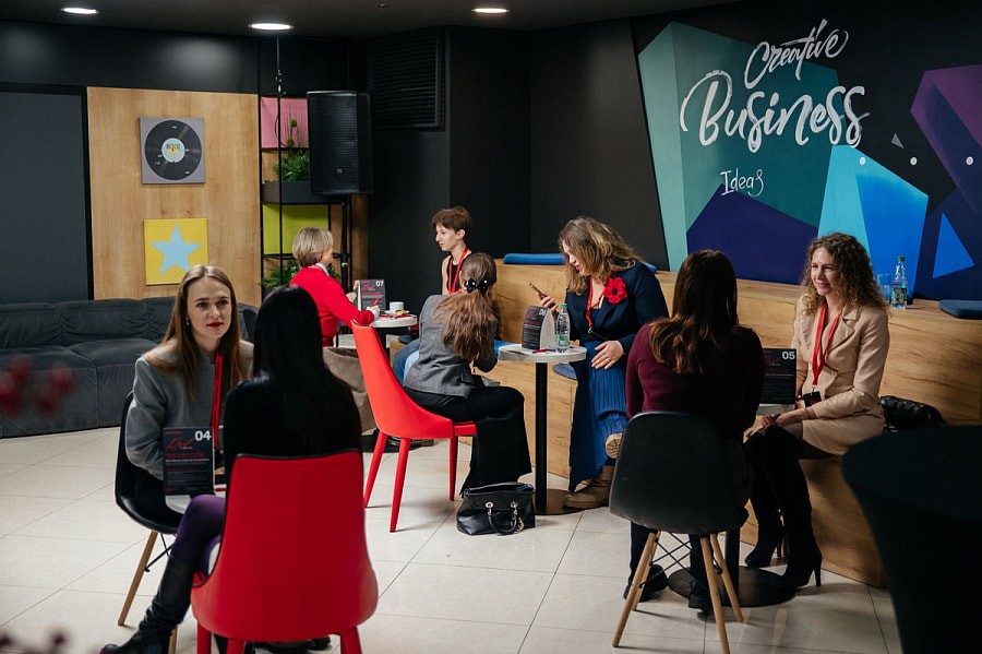 Уютный зал хаба на день превратился в стильное кафе, где за столиками только бизнесвумен. Некоторые, кстати, пришли в красном.