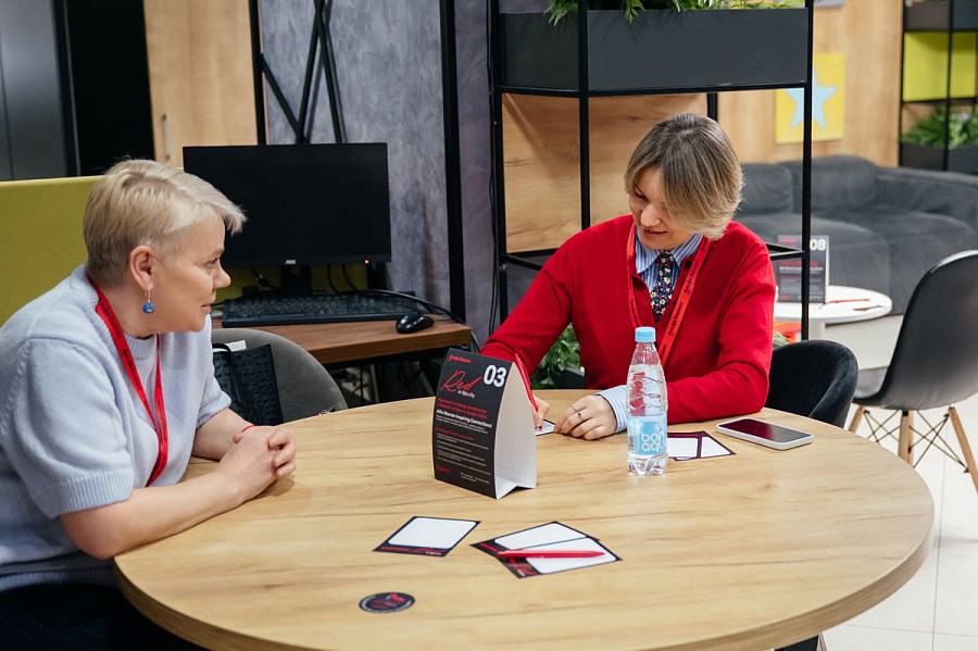 После финального раунда — кофе-брейк. Расслабленная атмосфера с напитками и закусками располагает к продолжению общения, и участницы делятся своими впечатлениями.