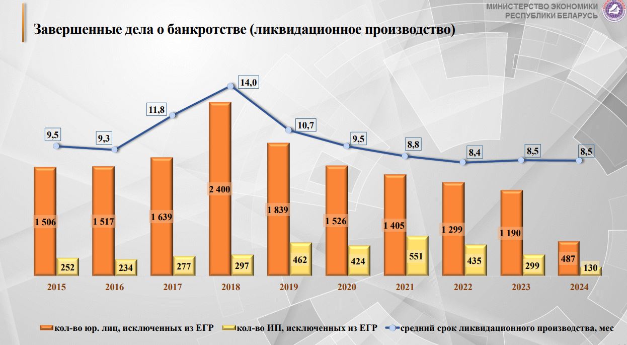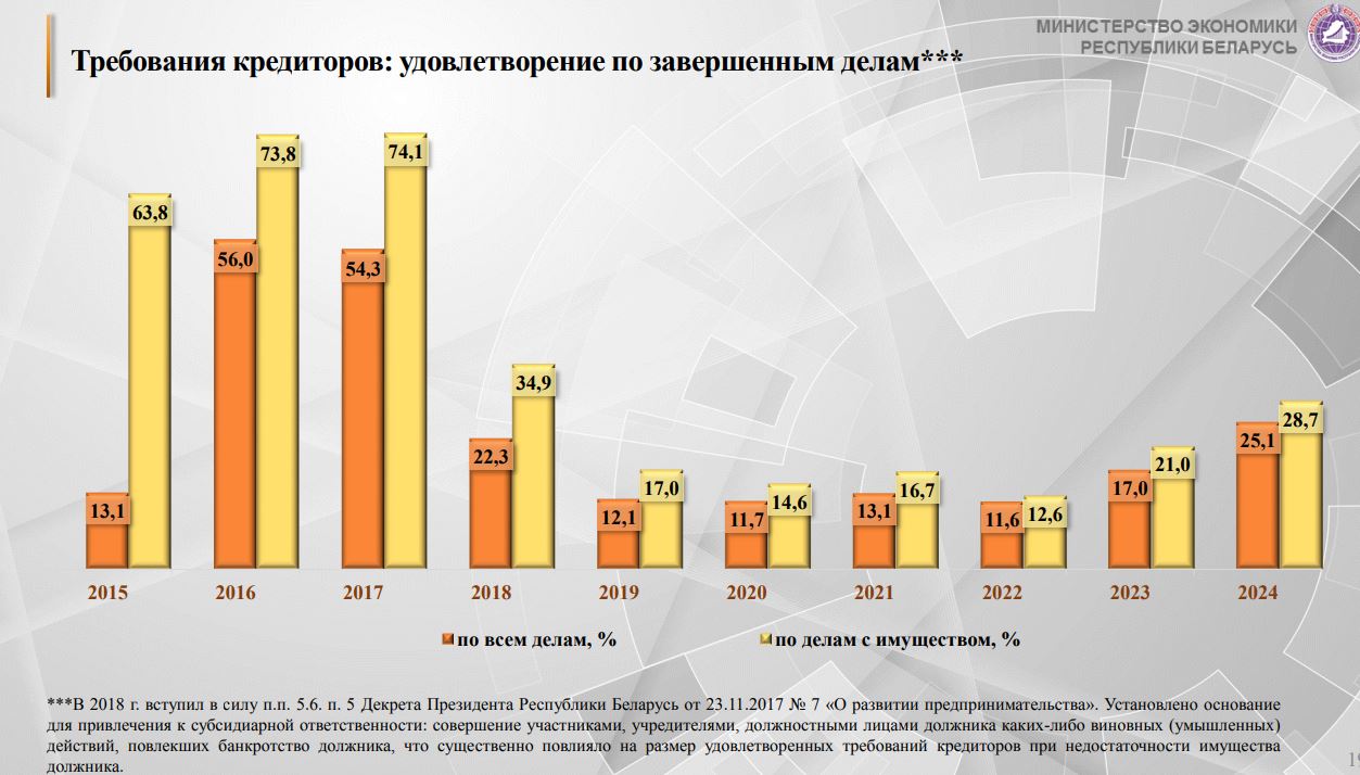 Как уточнили в Минэкономики, в 2018 году вступил в силу п.п. 5.6. п. 5 Декрета главы государства № 7 «О развитии предпринимательства». В итоге установлено основание для привлечения к субсидиарной ответственности: совершение участниками, учредителями, должностными лицами должника каких-либо виновных действий, повлекших банкротство должника. Это существенно повлияло на размер удовлетворенных требований кредиторов при недостаточности имущества должника. Так, в 2018-м процент удовлетворенности снизился до 22,3%. Но в тот год был резкий скачок по числу исключенных из ЕГР компаний — 2,4 тыс.