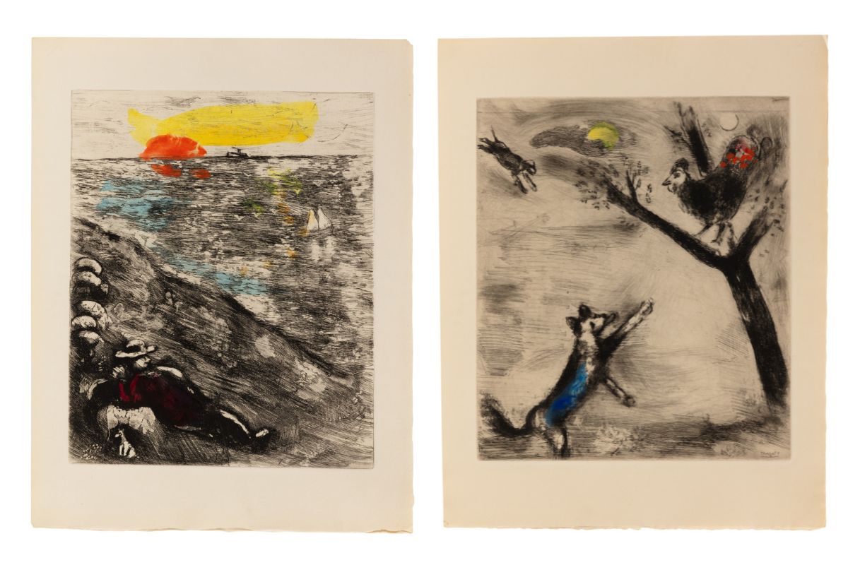 В состав одного из самых крупных лотов вошли 102 офорта художника. Это выполненные вручную Шагалом иллюстрации к «Басням Лафонтена». Художник сделал их в 1952 году после работы над иллюстрациями для «Мертвых душ» Гоголя.