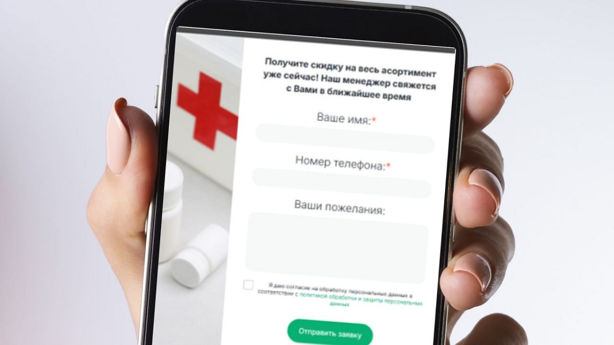 Посетителям фишингового ресурса предлагают указать в специальной форме имя и номер телефона якобы для того, чтобы «получить скидку на весь ассортимент лекарств».