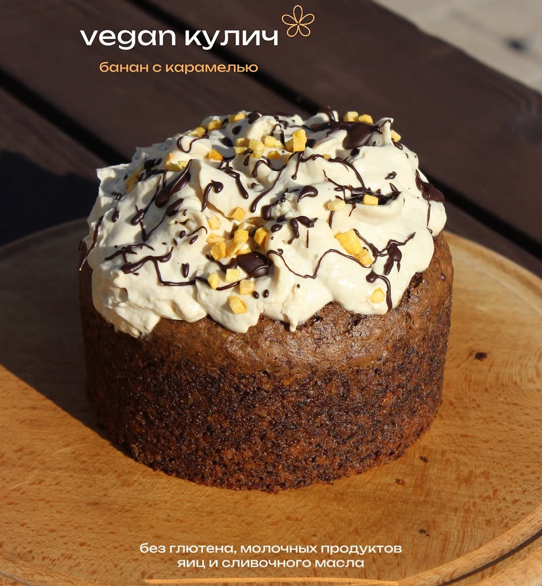 В кафе-кондитерской PilliGreen веган-кулич на основе кокосового молока и банана, с грецким орехом, карамелью и шоколадом стоит 55 рублей (550 г) и 80 рублей (950 г).