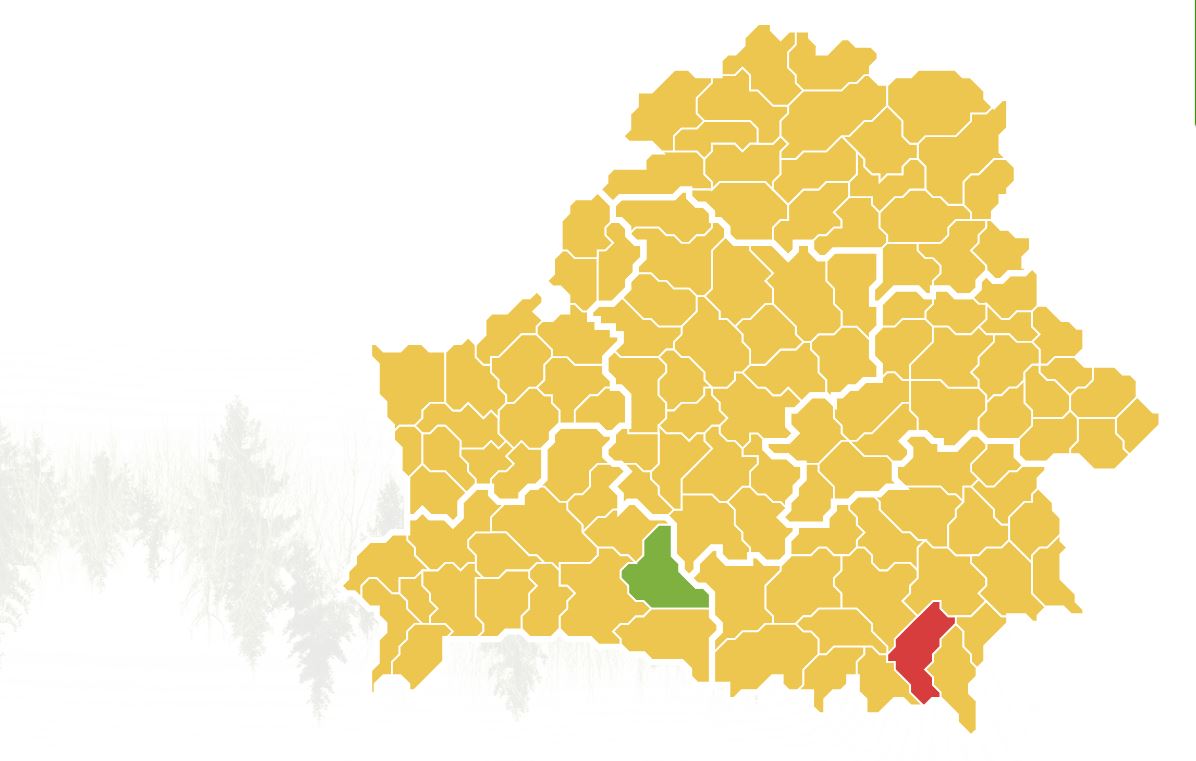 Зеленым оставался на карте лишь Лунинецкий район Брестской области. А красным окрасили Хойникский район в Гомельской области.