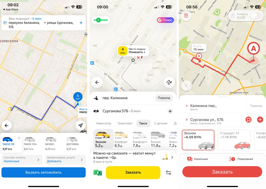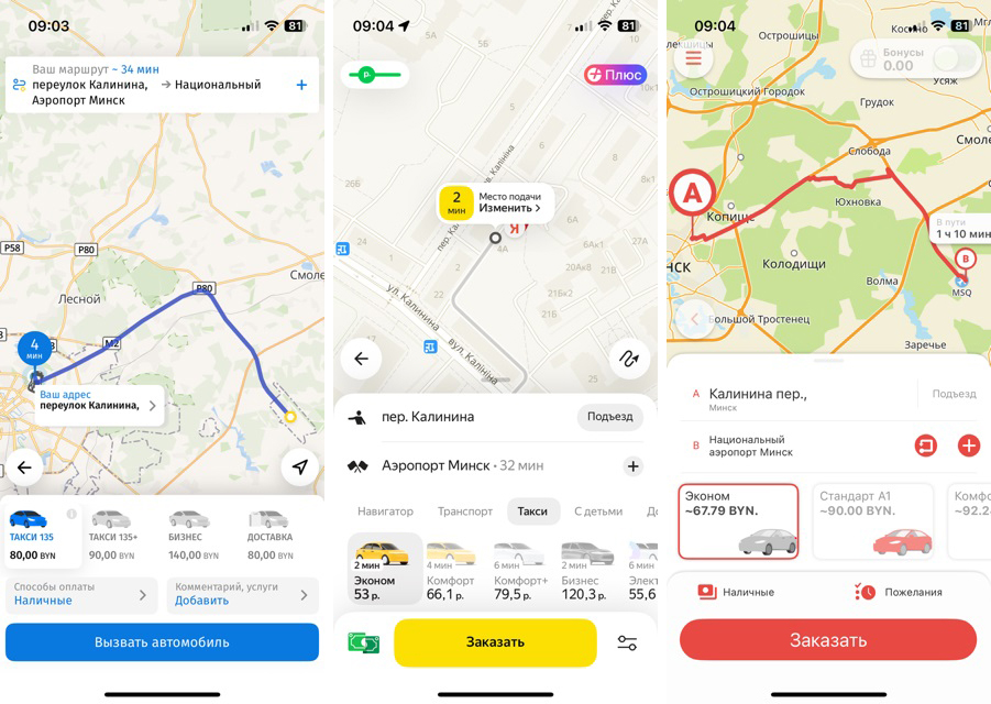 Что и как сравнивали? Для нашего эксперимента мы выбрали три службы: «Яндекс Такси», которому сейчас принадлежит 90% рынка, новое такси от А1 и одну из старейших служб — «Такси 135». Утром 1 мая мы сделали запрос в приложениях этих служб по разным маршрутам — по Минску на небольшое расстояние, в другой конец города и в аэропорт. Важный момент: мы сравнивали динамические тарифы и во всех трех службах выбрали самый дешевый тарифный план.
