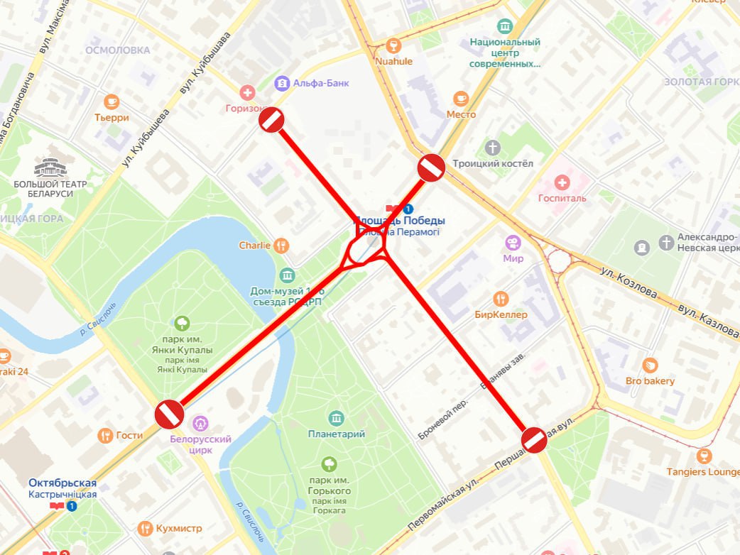 Как уточнили в ГУВД Мингорисполкома, с 6 утра ограничат движение транспорта, кроме общественного, по проспекту Независимости от улицы Янки Купалы до улицы Козлова, а также по улице Захарова от проспекта Независимости до улицы Первомайской и по улице Киселева от проспекта Независимости до улицы Красной.