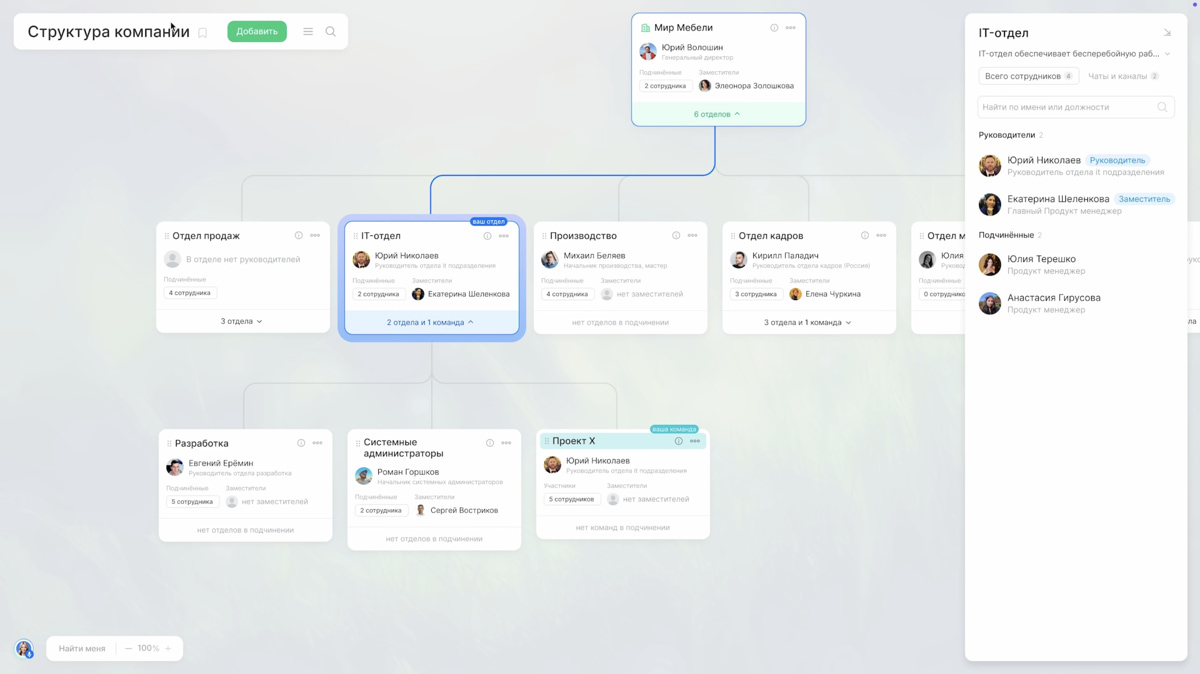 Добавили новое структурное подразделение — «Команды». Понадобится компаниям, в которых сотрудники разных подразделений и отделов часто объединяются в команды для крупных долгосрочных проектов.
