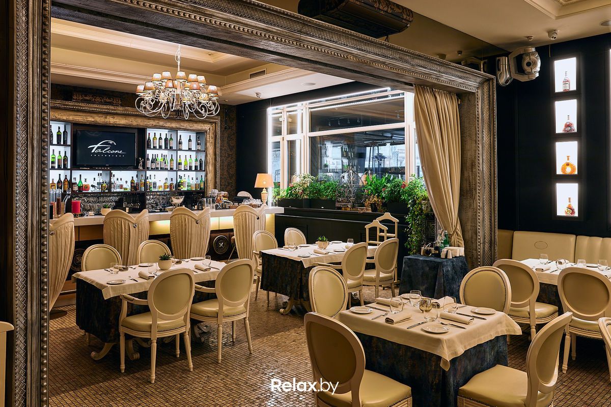 Falcon в Минске считался рестораном премиум-класса. В его меню было много блюд из морепродуктов, паст, ризотто. Например, морской гребешок с кремом «Сельдерей», печеными перцами и соусом «Сладкое вино» стоил 110 рублей за 210 грамм. А одной из самых дорогих позиций была говядина «Вагю» с соусом «Джек Дениелс» за 500 рублей.