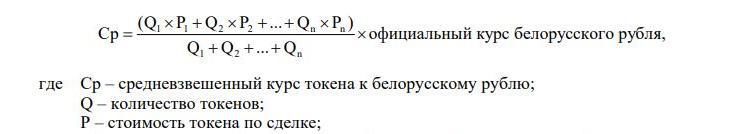 о средней стоимости токенов, которая представляет собой среднее арифметическое значение средневзвешенных курсов, выраженных в белорусских рублях, которые рассчитываются по специальной формуле: