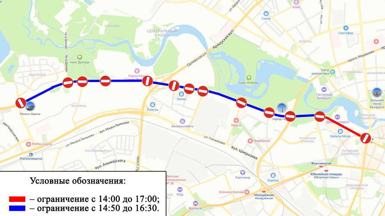 с 14:50 до 16:30 — по проспекту Победителей от улицы Мельникайте до улицы Нарочанской.