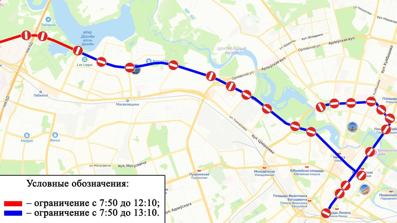 по улице Ленина от проспекта Победителей до проспекта Независимости;
