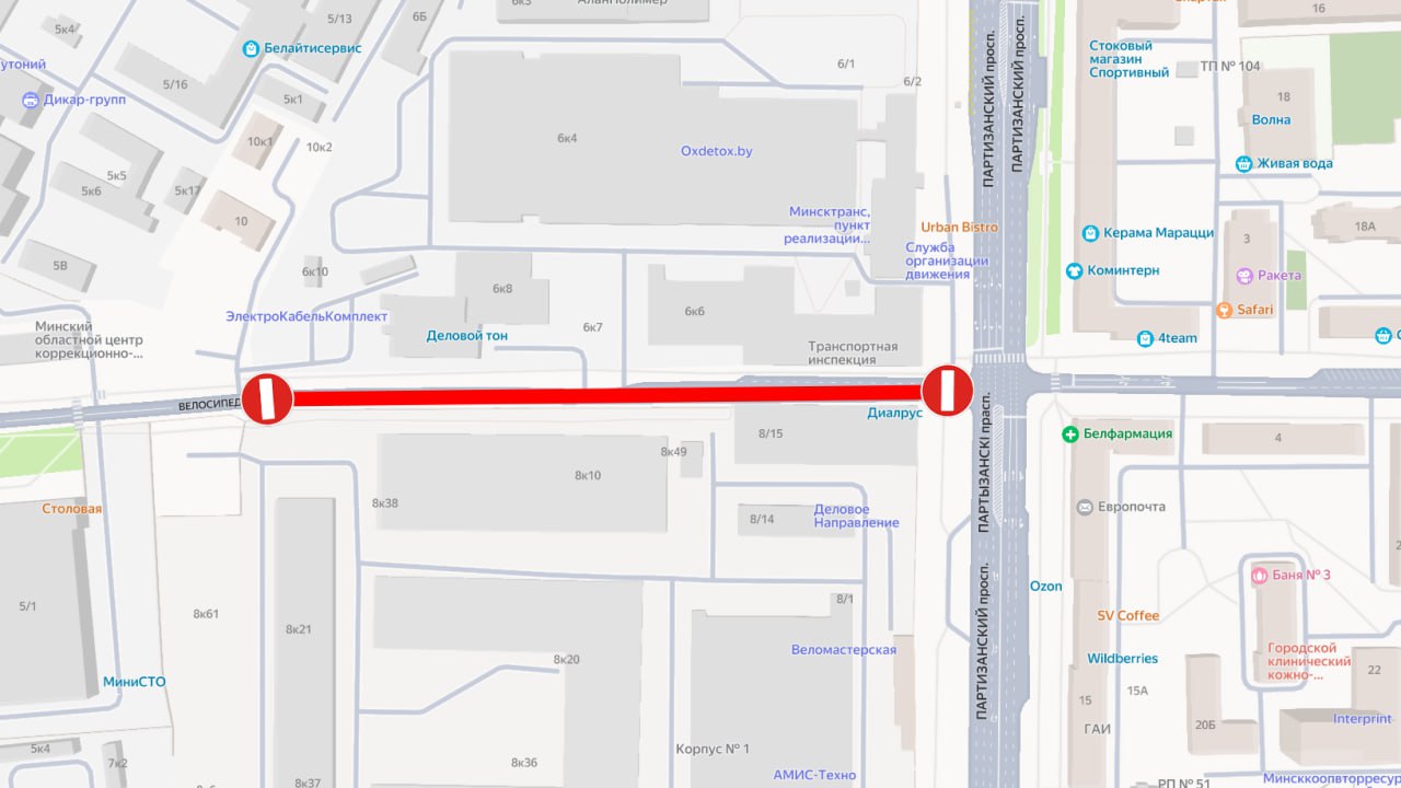 Из-за ремонта движение по Велосипедному переулку перекроют на участке от Партизанского проспекта до въезда на территорию, прилегающую к зданию № 6 по Партизанскому проспекту.