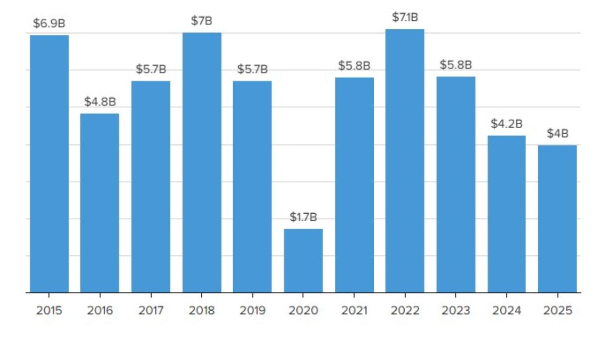 ArtTactic отмечает, что продажи на аукционах Sotheby’s, Christie’s и Phillips за первое полугодие упали до $3,98 млрд. Это на 6% меньше, чем за такой же период прошлого года. Общая сумма продаж на аукционах достигла минимума за десятилетие. Она сократилась по сравнению с первым полугодием 2022 года на 44%, или на $3 млрд. В 2023-м падение составило 19%, в 2024-м — 26%.