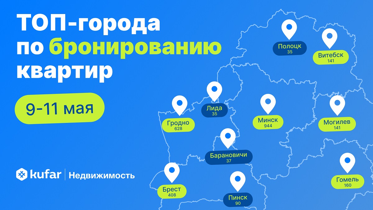 Уже сейчас в столице на 9–11 мая количество бронирований достигло 944. В пятерку самых популярных локаций также вошли Гродно (628), Брест (408), Гомель (160), Витебск и Могилев (по 141). Если не брать областные центры, то в лидерах будет Пинск (90 броней).